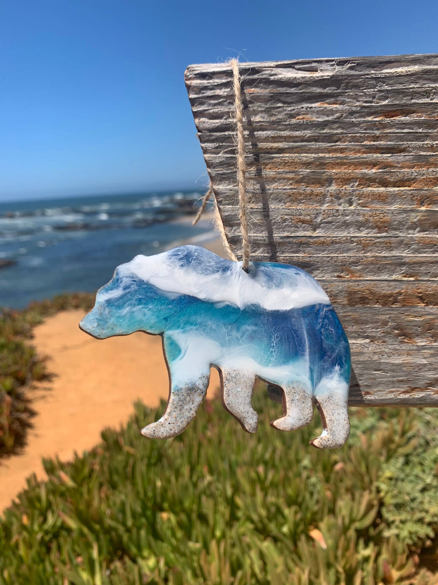 About this product Don't miss out on the opportunity to enchant customers with our wholesale North Carolina resin ornaments. Tiny bubbles and the ocean blue, celebrate your state of North Carolina! Elevate your inventory with these exquisite coastal treasures and spread holiday cheer with a touch of East Coast magic. Due to the handmade nature of this item, each item is unique and will vary. Real sand you can feel in each ornament. Ornament is 4 inches long. Backs are a sanded wood to remove resin, but may have slight discoloration. Item sells easily for $18