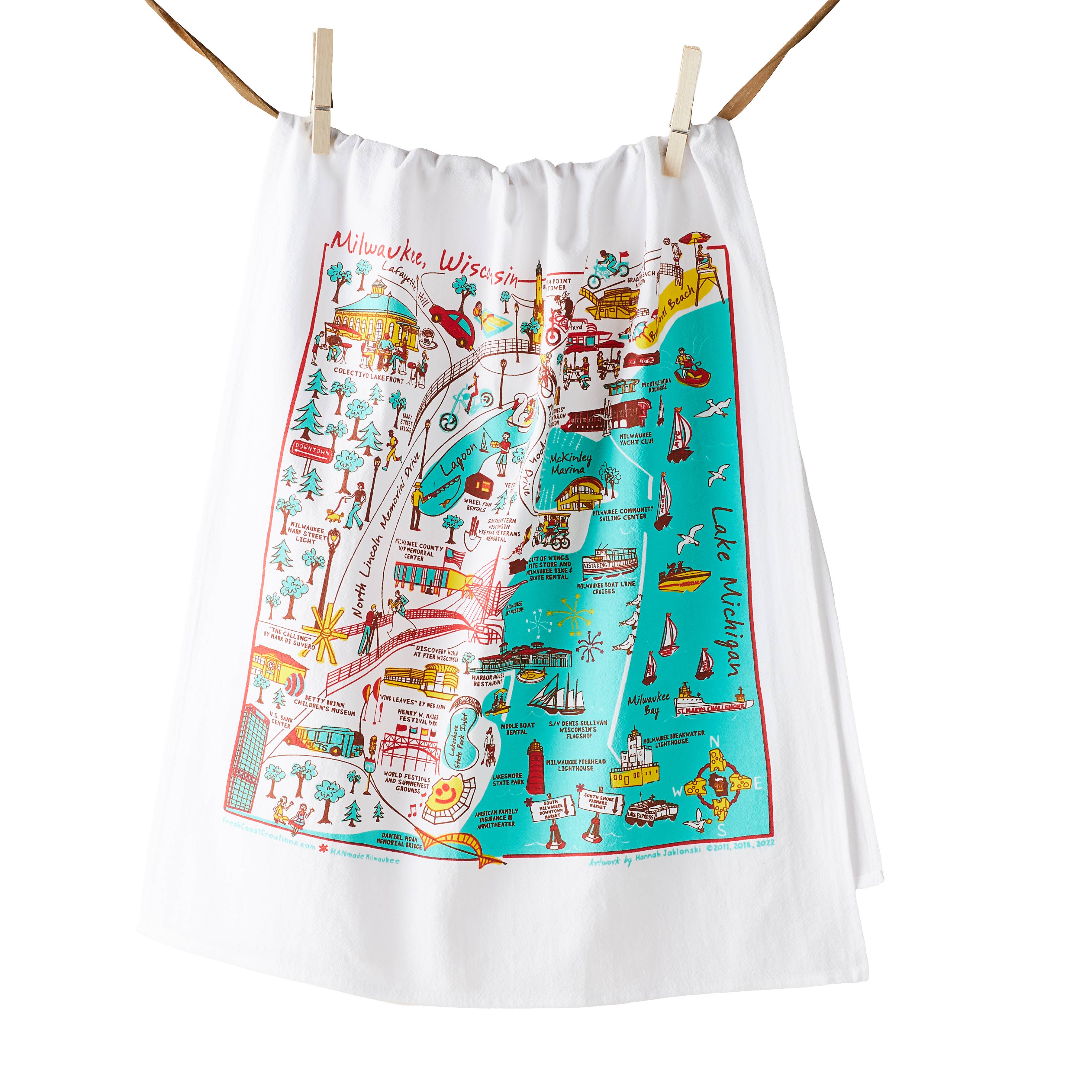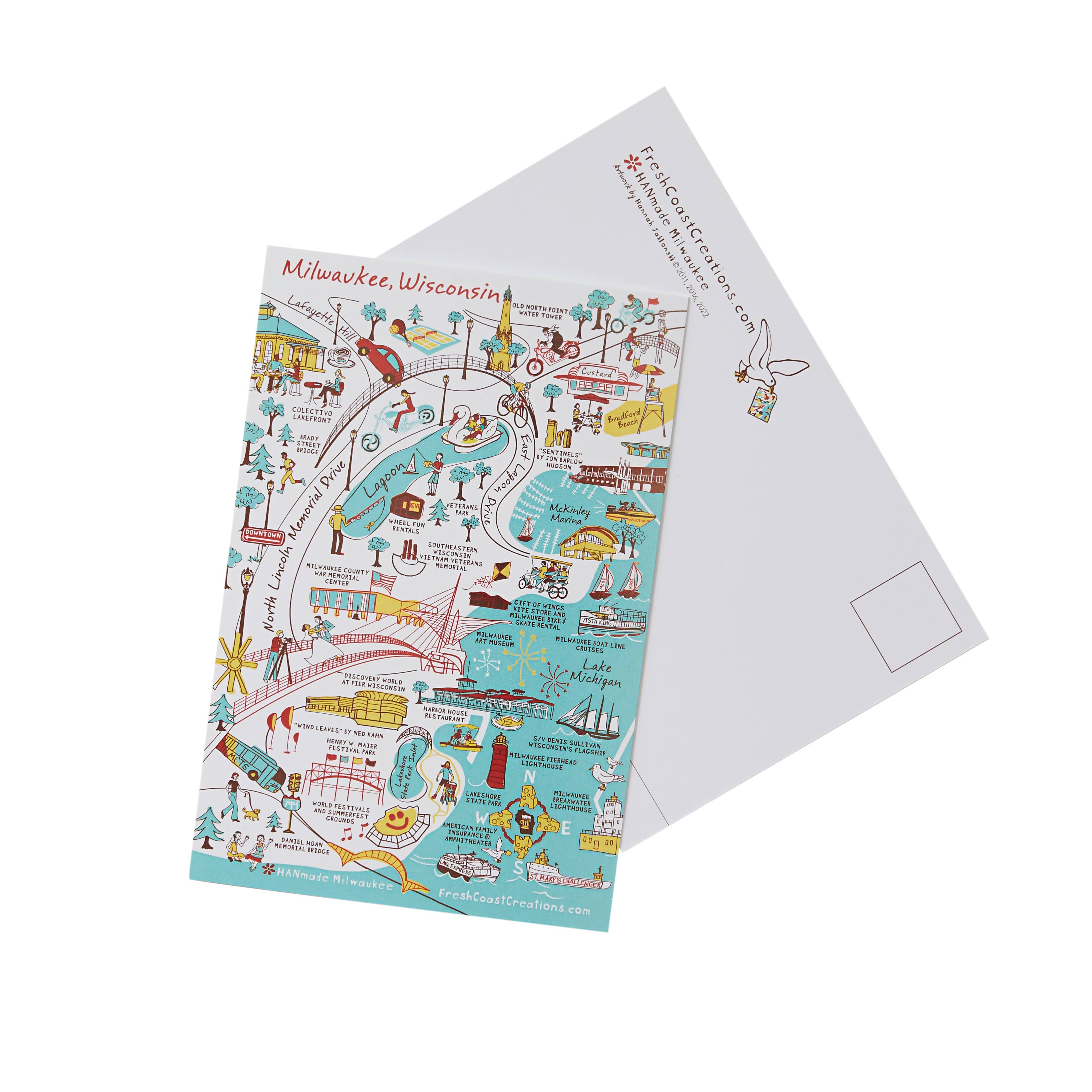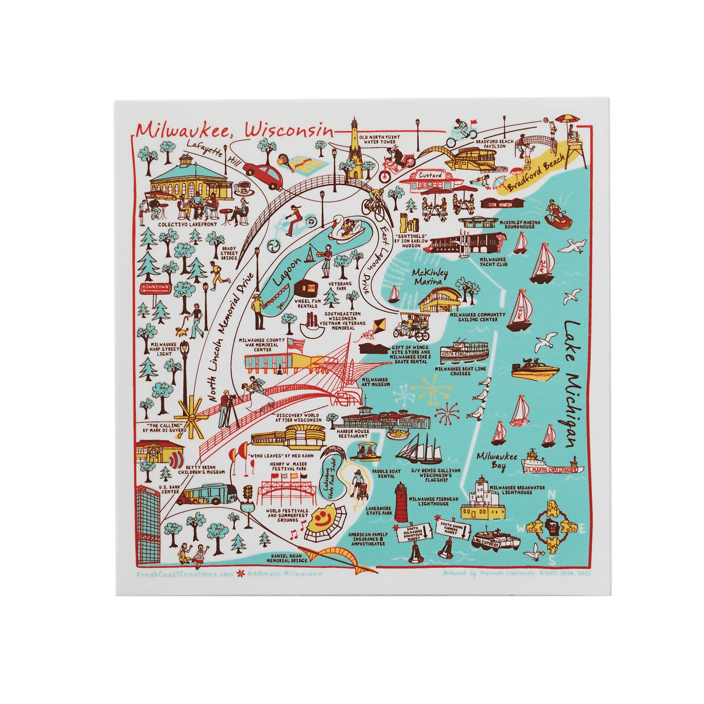 The Milwaukee Lakefront magnet highlights downtown Milwaukee, Lake Michigan and all of the lakefront attractions. Based on a hand-drawn design, the design features Summerfest, the Hoan Bridge, Colectivo on the Lake, Bradford Beach, McKinley Marina, the Milwaukee Art Museum, Lakeshore State Park, Discovery World, U.S. Bank Center, the Milwaukee County War Memorial and much more. 3" x 3" square magnet. Stick on your refrigerator or any other magnetic surface.