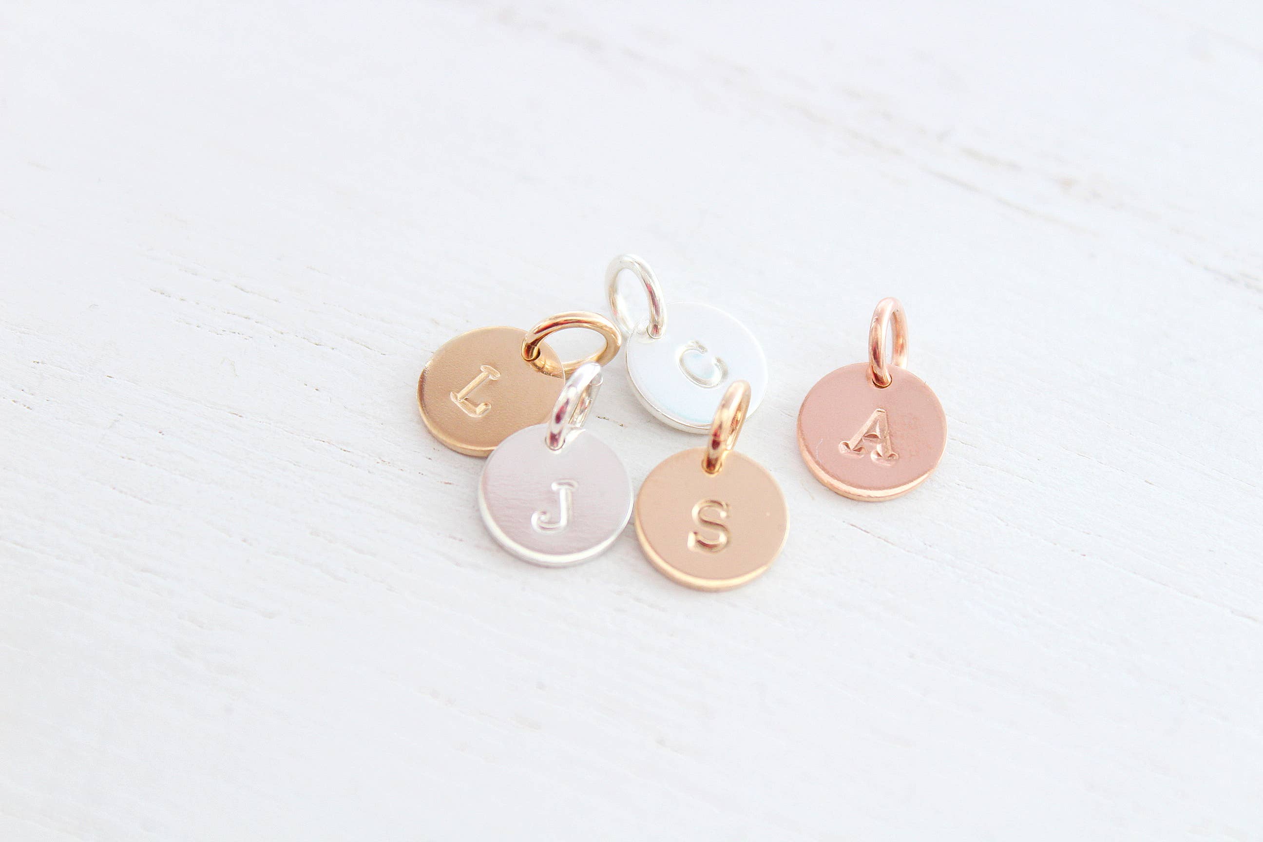 These beautifully handcrafted 9mm initial disc charms are designed to complement your existing necklaces and bracelets, this tiny charm is full of meaning and elegance. Each charm is stamped with a single uppercase letter in a classic, hand-stamped font and made from high-quality 14k gold filled, sterling silver, or 14k rose gold filled disc charms. _______________________________________ ✨MATERIALS & DIMENSIONS • Pendant Size: 9mm diameter (≃ 3/8 inch) • Jump Ring: 4.5mm – ready to slide onto most chains • Material Options: - 14K Gold Filled - 14K Rose Gold Filled - Sterling Silver • Finish: Hand-stamped, polished disc You will receive a complete set of 26 charms, one for each letter of the alphabet — from A to Z. It's a perfect option for creating personalized gifts, customizing multiple pieces, or keeping a full range of initials on hand.