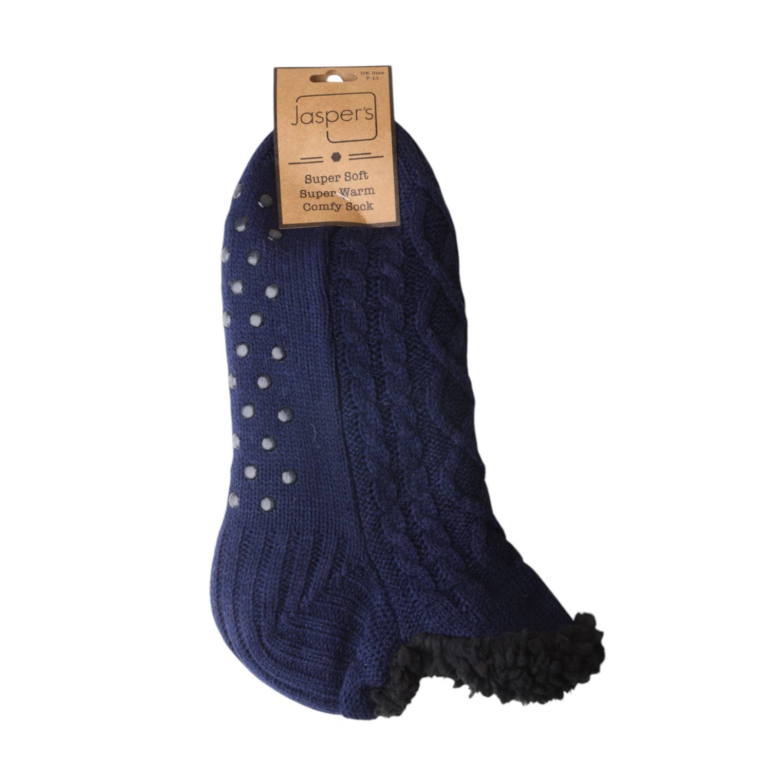 Light Grey Cable Knit. Cosy your feet at home with these super soft black fleece lined slippers Super cosy Grey and Black Slippers Black Fleece Lined Anti slip dots on the bottom Pure Comfort, Treat your Feet Alternate colours and patterns available in ladies & men's sizes Recyclable packaging Measurement: Men's 7-11 UK Cool wash Not suitable for tumble dryer Check out our other styles and colours here Looking for our ladies slipper range, take a look here Outer - 85% Polyacrylic, 15% Polyester. Inner - 100% Polyester Perfect for: feet warming, gift for him, gift for Christmas, gift for Father’s Day, stocking fillers, for the eternally cold footed, birthday gifts, cosy home gift, self care, self gifting