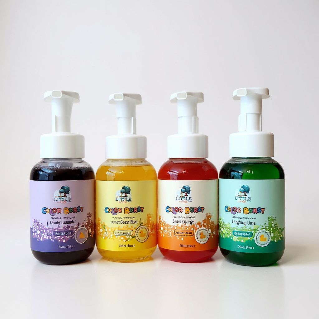 Introduce fun and vibrant handwashing with our colorful foaming hand soap designed especially for kids! Available in four playful colors and scents, this non-toxic soap combines: * Organic and natural oils * Food-grade dyes * Delightful fragrances * Natural fragrance Make washing hands an engaging experience. The rich, colorful foam encourages proper hygiene while being gentle and safe for children. Each 10-ounce bottle includes a small rubber duck for added enjoyment and is perfect for bath time and creative soap art as well. Our non-staining formula keeps sinks and tubs clean, making it an ideal choice for toddlers through elementary school kids. More exciting colors and scents are on the way! Ingredients: Organic Saponified Oils (Coconut, Olive and Jojoba), Vegetable Glycerin, Lime Essential Oil, Sage Essential Oil, Rosemary Extract, Organic Aloe Vera. FD&C food quality colorants (Sorbitol, Water, Glycerin, Carboxmethylcellulose sodium and Potassium sorbate. *Contains a small toy. Choking hazard for children under 5. Always supervise young children at play.