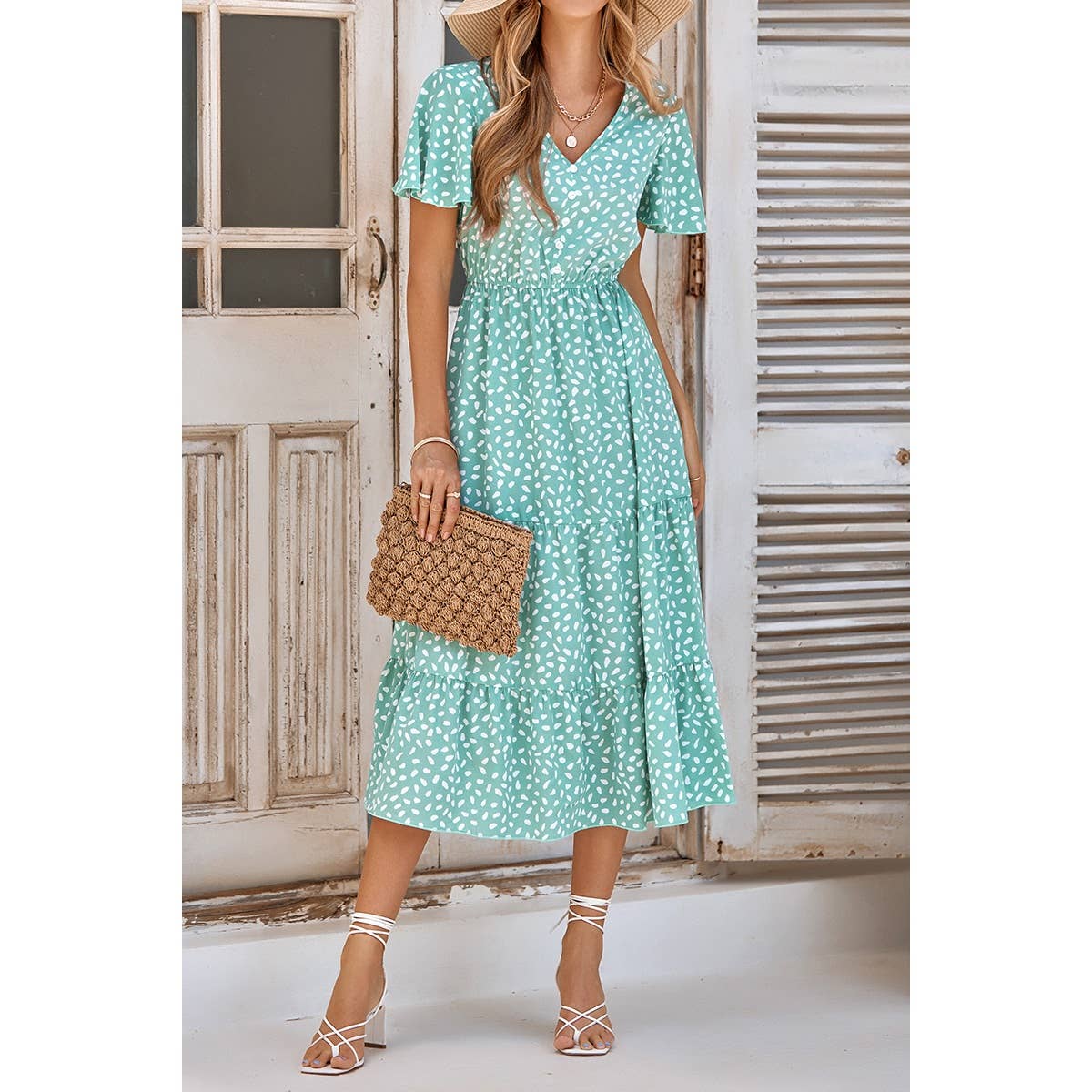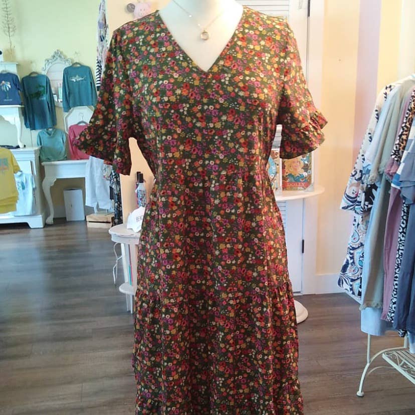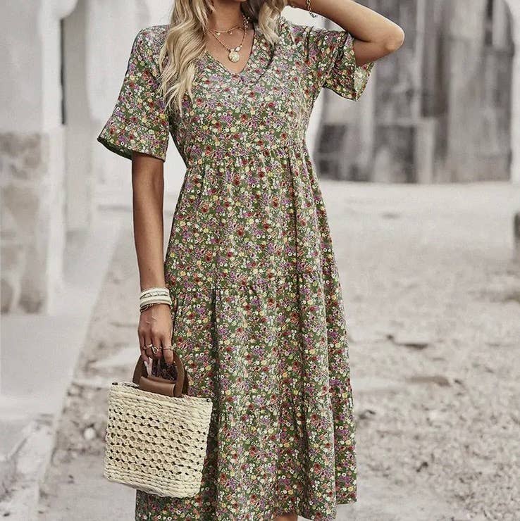 SKU: D2313066APS Made in China Aesthetic: Casual and Classic Care instructions: Hand wash Dress style: Fit & flare Fit: Junior and Missy Neckline: V-neck Occasion theme: Everyday Occasion: Day party and Everyday Pattern: Floral Season: Spring/Summer Skirt & dress length: Midi Sleeve length: Short-sleeve Weight: 408.23 g (14.4 oz) Dimensions: 20.3 x 7.6 x 1.3 cm (8 x 3 x 0.5 in) Packaging: Recyclable