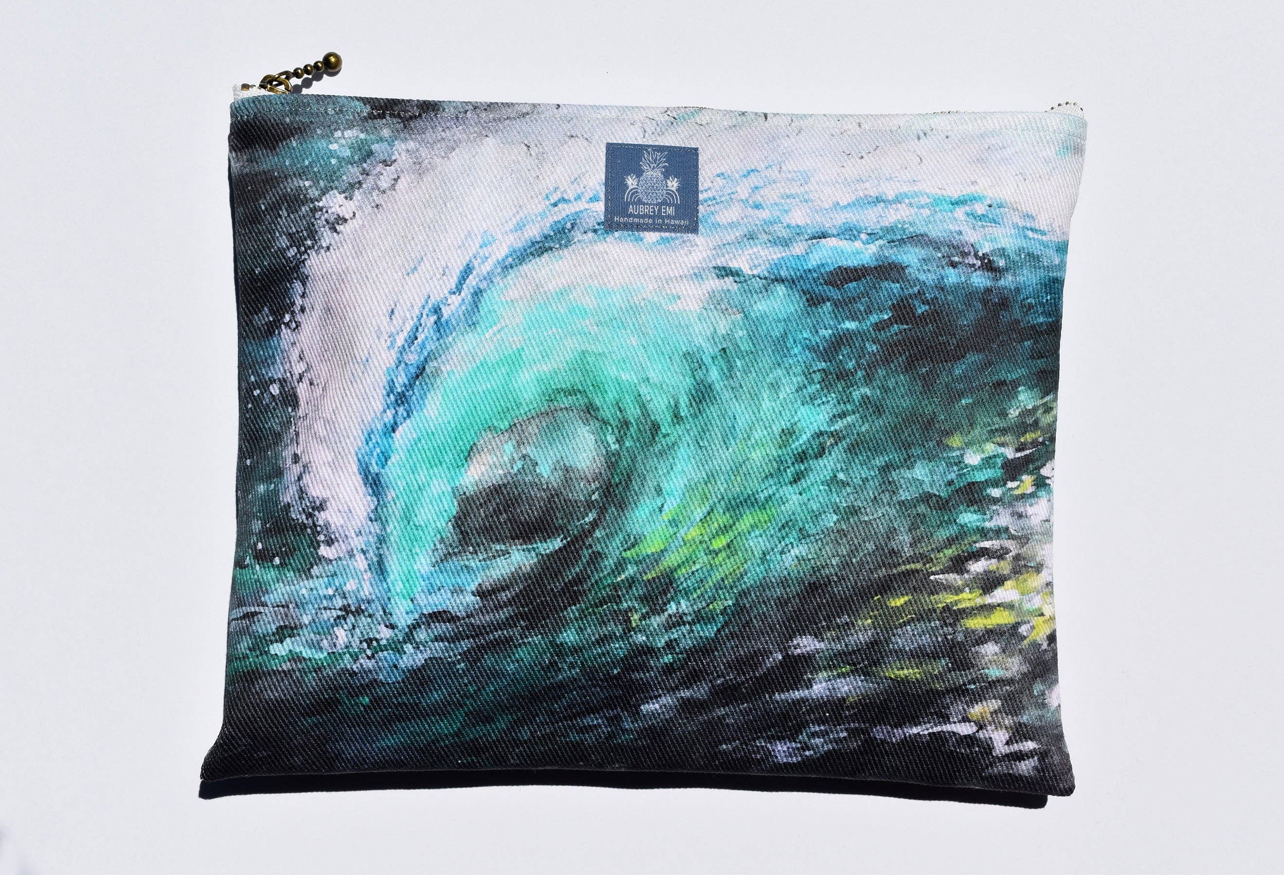 Small Pouch: approx. 6"x8" (Unlined) Medium Pouch: approx. 8"x10" (Lined inside). Large Pouch: approx. 9"x13.5" (Lined inside). Made in Hawaii. Washing Instructions: 100% cotton denim. To preserve color, quality, and avoid shrinkage recommended care is Hand wash or Machine wash in Cold Water flipped inside out. Hang or lay flat to dry. All original artwork and designs by Aubrey Emi. All images are © Aubrey Emi LLC.
