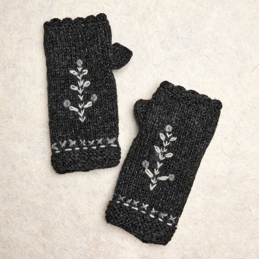 Introducing our Cherries Noir handwarmers, where the beauty of nature's cherry meets vintage polka dots for a design created to add warmth and charm to your ensemble. Pair with cherries headwear for a coordinated look or with solid ecru or noir headwear for a contrast. Each piece is handmade in Nepal by skilled artisans with wool and fleece lining. The process involves dying the wool fibers with azo free dyes, hand knitting the fibers and adding a warm and comfortable fleece lining. Hand embroidered flowers are the final touch. In the end, the fibers come to life as unique knit accessories! Each piece is handmade in Nepal by skilled artisans with wool and fleece lining. The process involves dying the wool fibers with azo free dyes, hand knitting the fibers and adding a warm and comfortable fleece lining. Hand embroidered flowers are the final touch. In the end, the fibers come to life as unique knit accessories!