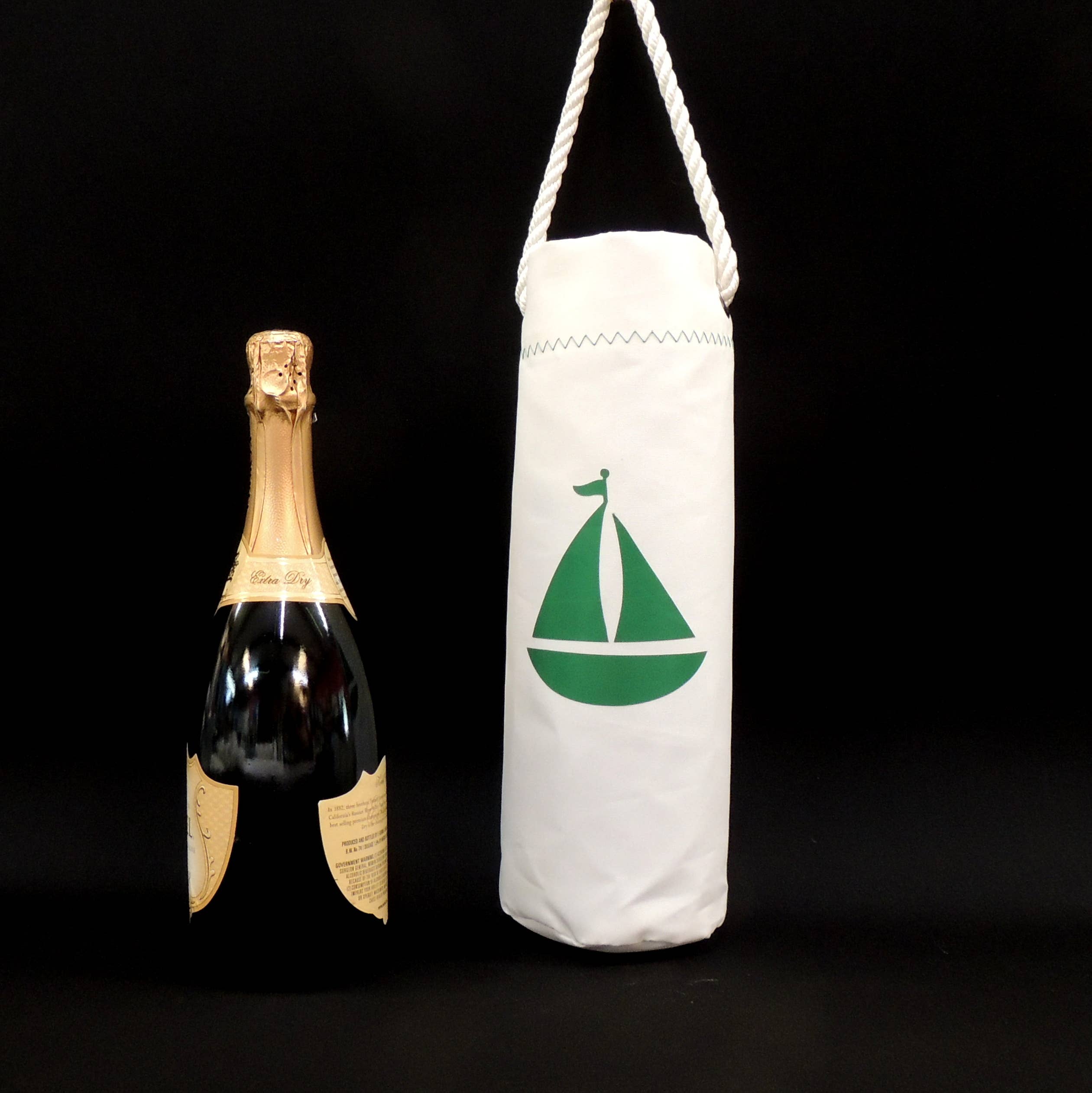 We've developed these cute useful Sailcloth Wine Totes, this one decorated with a red crab design! They are fabricated with Dacron sailcloth. The handle is made with soft 3 strand nylon line tied into marine grommets. The crab design is cut from insignia cloth, the same fabric used for insignias and numbers on sails. The shape is cylindrical, that is, the bottom is round, just like your wine or liquor bottle. They are MADE IN THE USA! Unfortunately, we can't include the wine! Real Dacron Sailcloth with Insignia Cloth design Zig zag stitched "hem" at the top using in the same red color Made in the USA by hand in our shop on the Mississippi Gulf Coast. Dimensions: 13.5 inches tall by 4 inch diameter circle bottom.