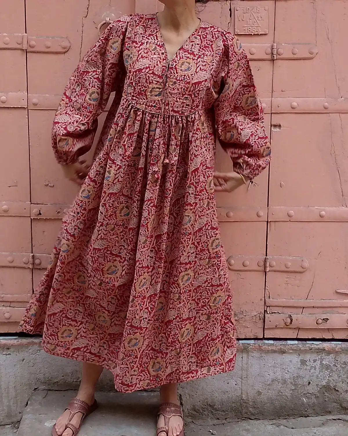 Red Maxi Dress | Block Print Organic Cotton Quilted Pom Pom