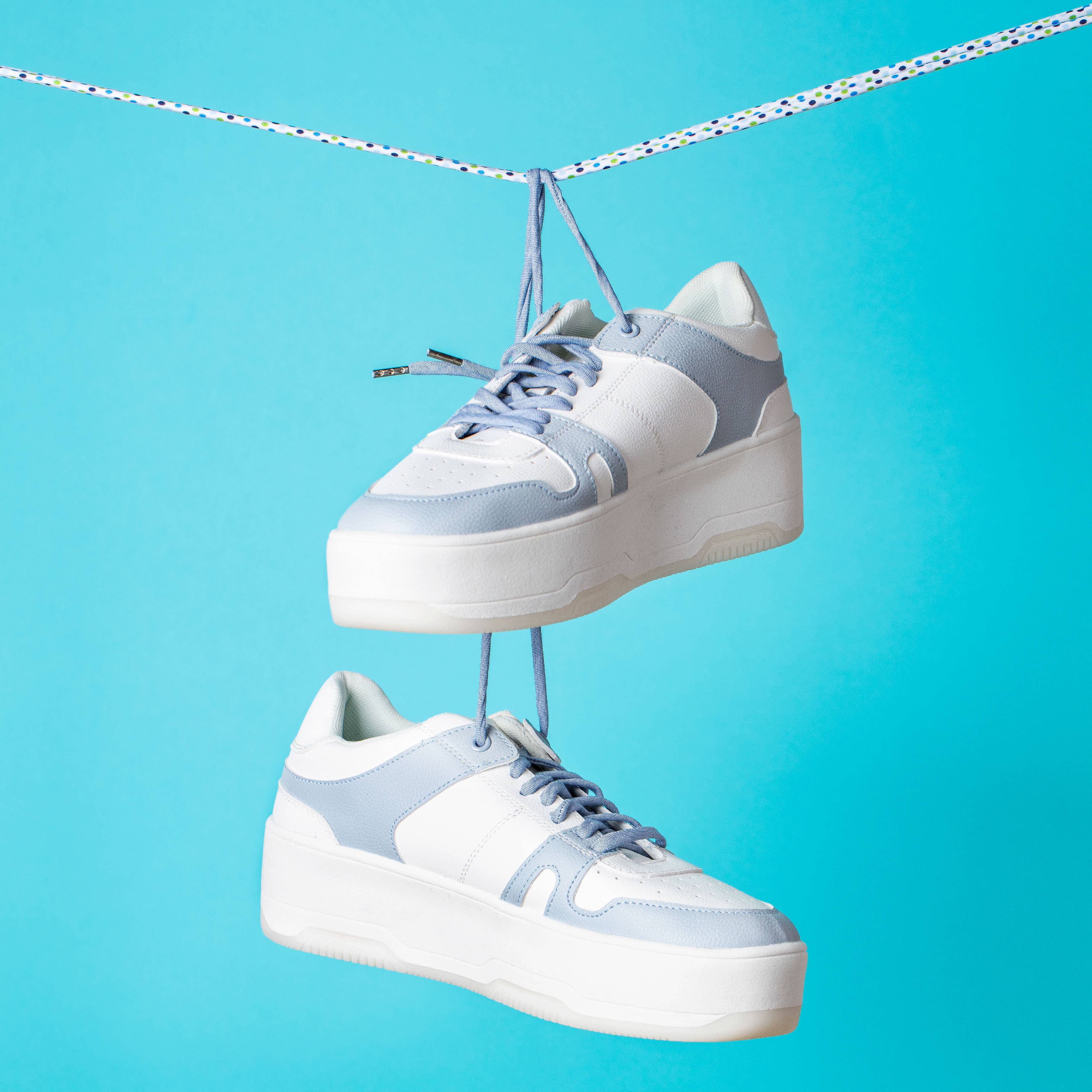 Denim blue round shoelaces made with Sure-Tie Technology so your shoes stay tied all day long. Made in the USA on antique machines.