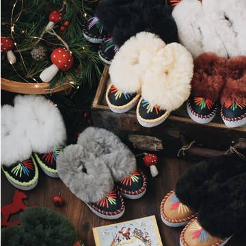 Assorted sale in 2 models. Sheepskin inner lining. Coral exterior. Embroidered patch. Anti-slip material on the sole. Print all over the shoe on soft short polyester.