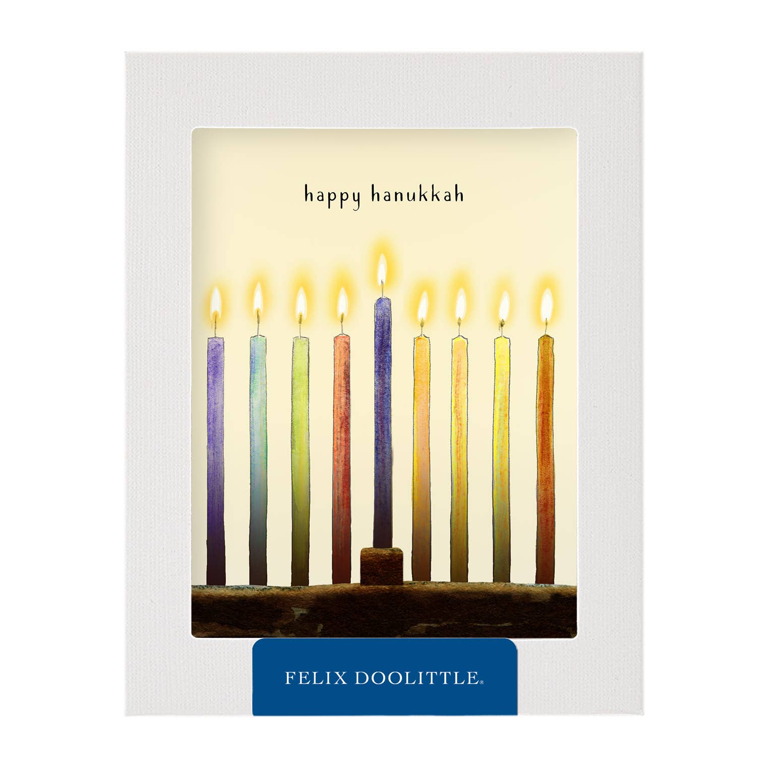 Featuring Felix's watercolor art, beautiful stock, and Felix's handwritten font, these charming boxed holiday cards are a delight. Quality envelopes add the finishing touch. 4.25 x 5.5 inches folded 8 cards & envelopes Ultra-premium, lightly-textured acid-free paper Presented in our new gray box - not the one shown - which is really lovely and has a clear window. Front: happy hanukkah