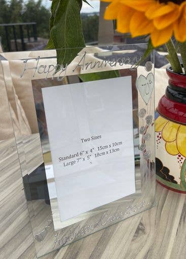 The 60th Wedding Anniversary is also known as Diamond Wedding. Our Dreamair® photo frames are hand painted in our studio in Stoke on Trent. Clear glass frames with a mirrored inset border hand painted on the glass using 3D liner - you can feel the difference - in three fabulous styles: Hearts/Flowers - with infills of colour sympathetic to the anniversary Milestone - the named anniversary infilled with crystals Black/Siver - bold contemporary stylishly simple Available in 2 sizes and two formats landscape and portrait. Clear glass photo frame Hand painted in the UK at our studio in Stoke on Trent Standard Portrait Frame holds a 10cm x 15cm (4" x 6") photo Large Portrait Frame Holds a 13cm x 18cm (5" x 7") photo Standard Landscape Frame holds a 10cm x 15cm (6" x 4") photo Large Landscape Frame Holds a 18cm x 13cm (7" x 5") photo INDIVIDUALLY BOXED