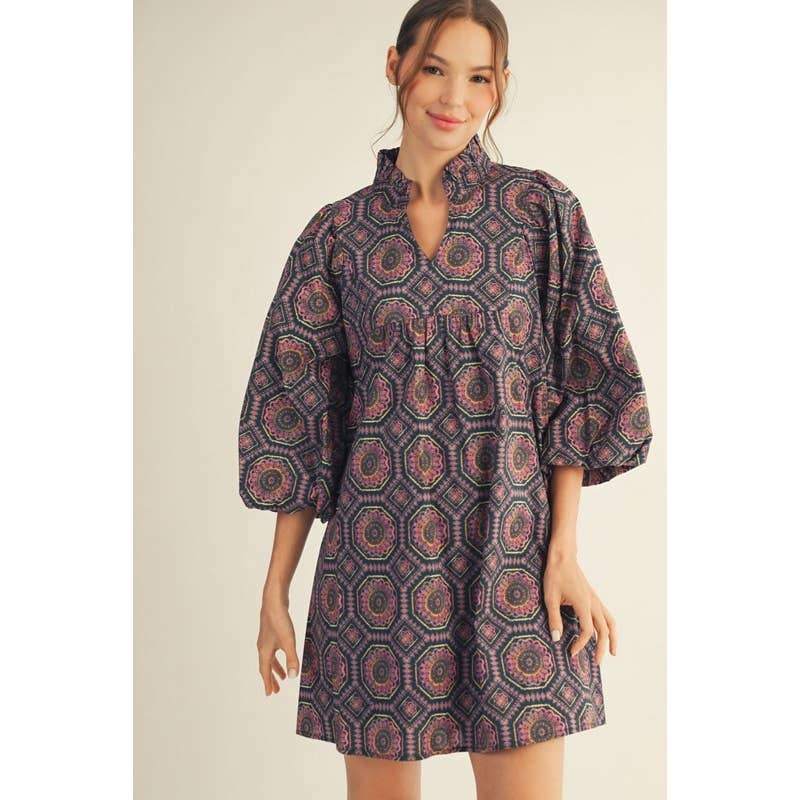 - Floral Babydoll Dress - Long sleeves floral babydoll dress with side pockets, ruffled high neckline, solid contrast detail, front button up. - Model is 5'10'' and is wearing a Small. - 100% COTTON
