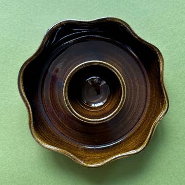 Stoneware dish, formed on a mould and painted by hand. Fired once to 1000 degrees celsius, then signed, waxed, and dipped into a homemade glossy honey glaze. A harlequin pattern is painted by hand on top of the glaze. Once dry the piece is ready for its final 1230 degree firing. Each piece is decorated by hand and will have slight variations. Dishwasher and microwave safe though discouraged for longevity. Approximately: 16cm x 11cm