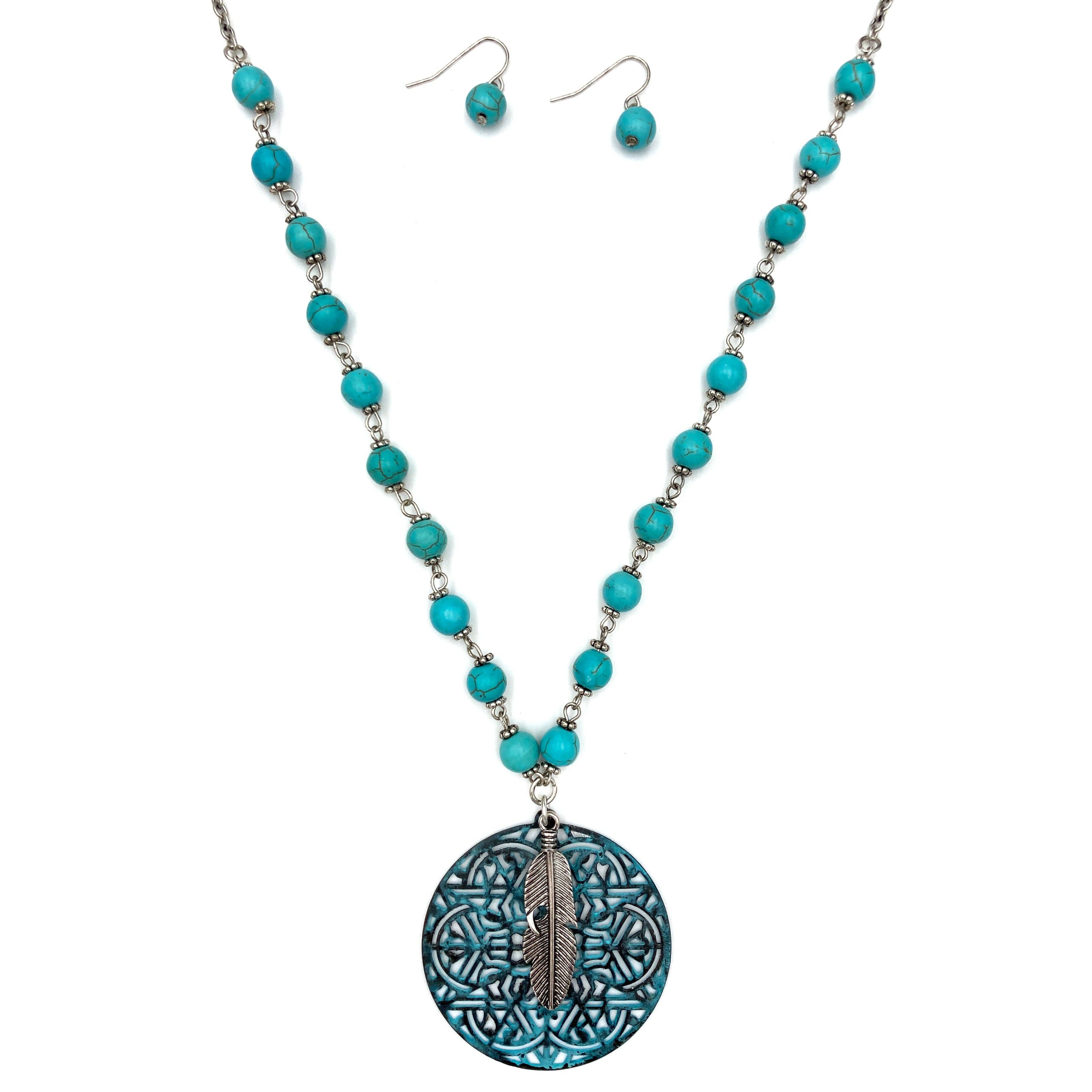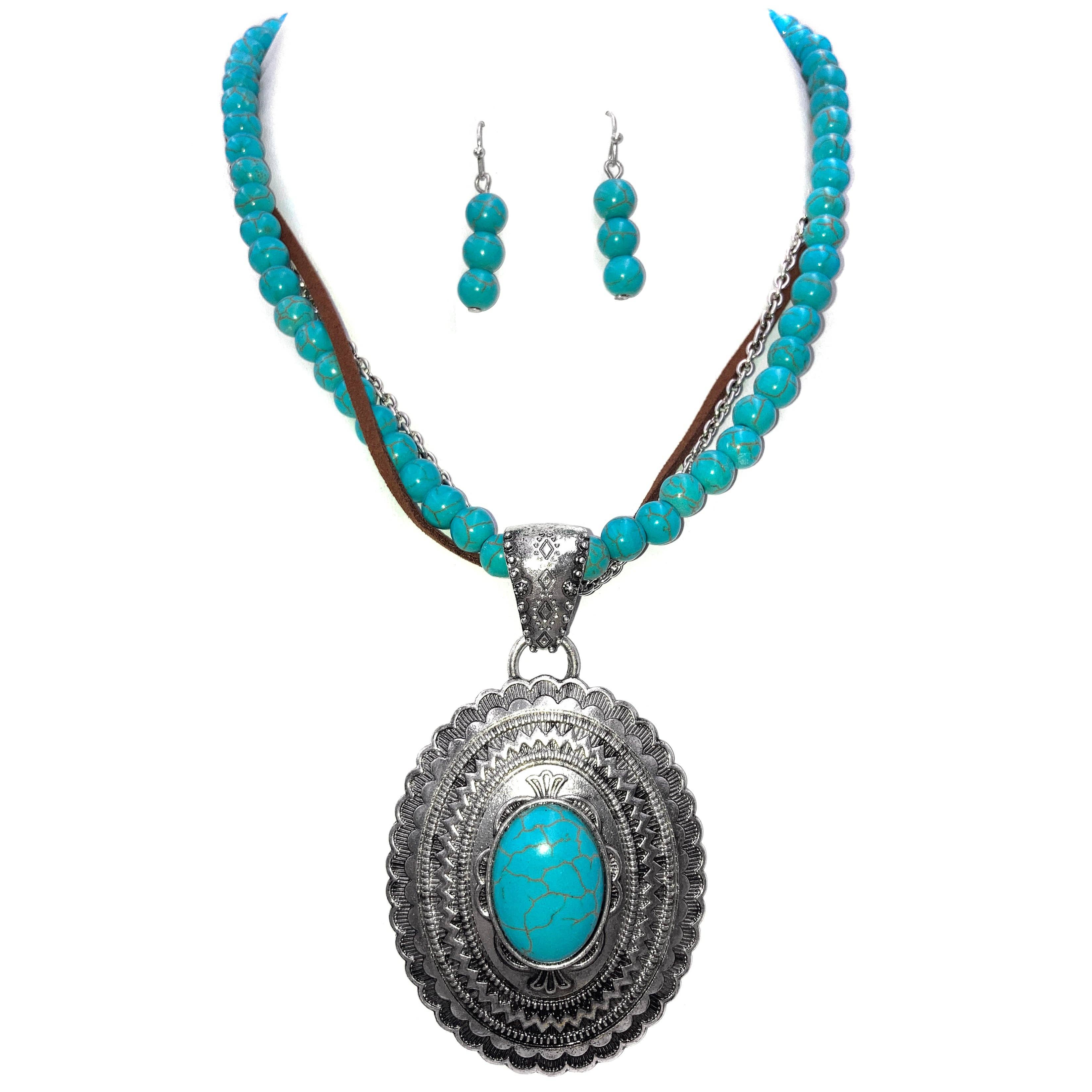 This 20" Cabochon Stone Circle Pendant Necklace Earrings Set is crafted with a bohemian, western design, featuring turquoise cabochon stone circle pendant and dangling turquoise earrings. Show someone you adore and admire them with this remarkable piece. It is compliant with Lead and Nickel standards, and should only be worn by adults.