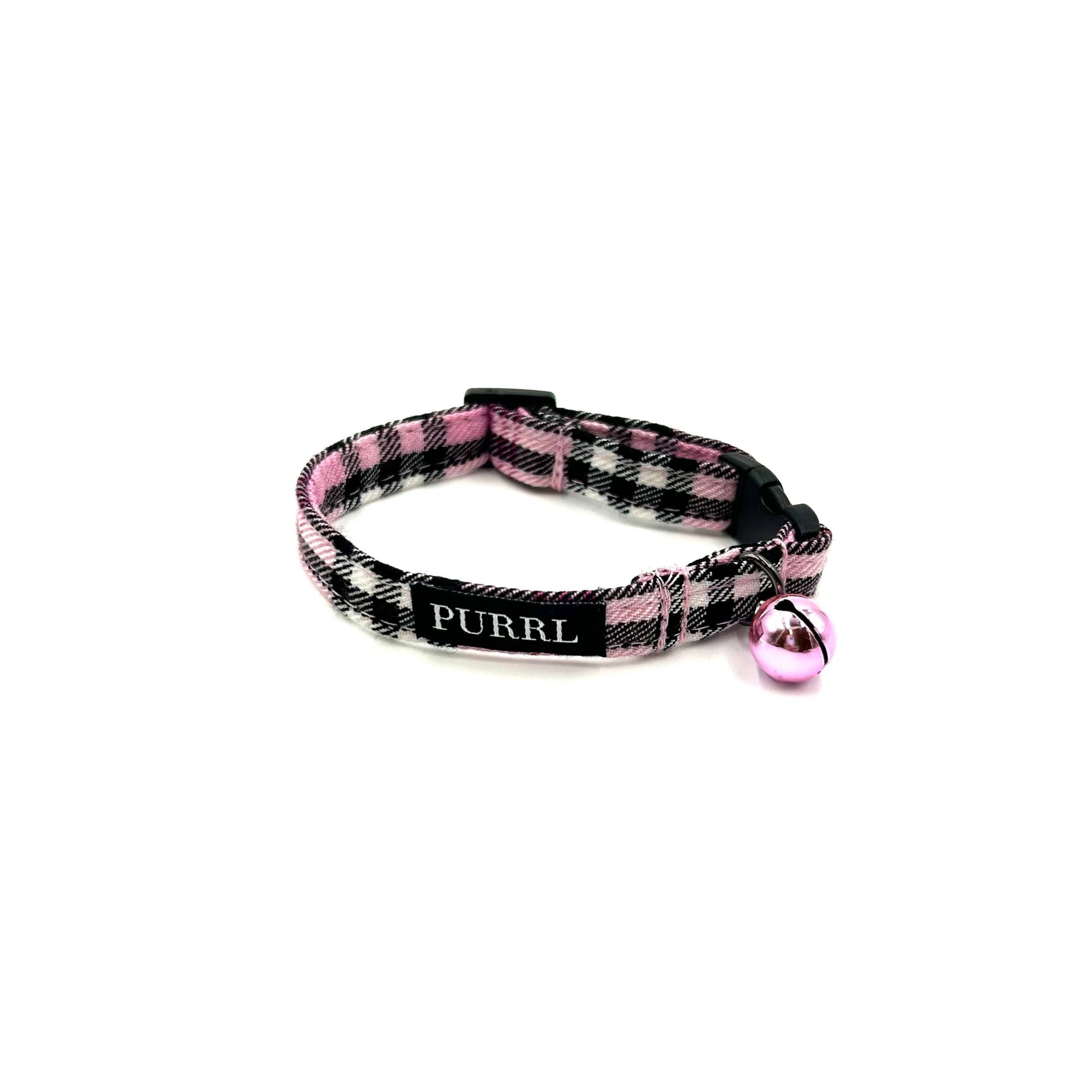 Pink faux-suede cat collar. Machine washable, does up with a safety kitty clip.. Handmade by us in our Suffolk workshop.