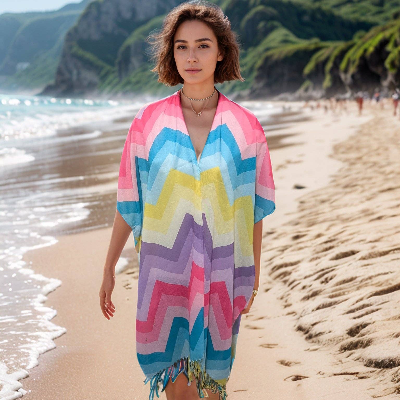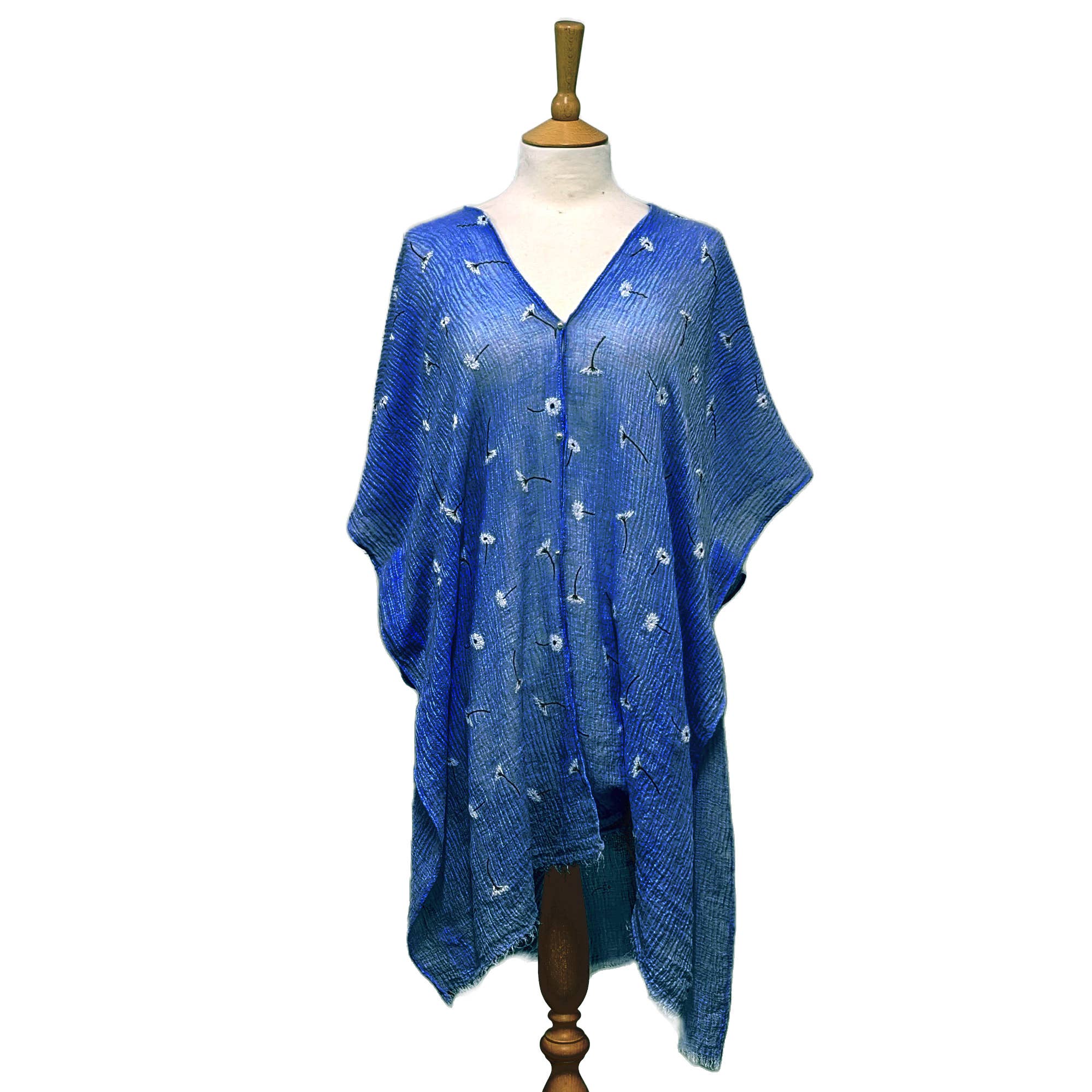 Effortless Elegance with Our Watery Waves Kaftan Chic and Versatile Design: Elevate your beachside look with our simple open-fronted kaftan featuring a mesmerizing watery waves design in various blue tones Compact and Travel-Friendly: Pack light and stay stylish with our kaftan, designed to fold down small for easy packing and effortless elegance on the go Comfortable and Lightweight: Enjoy all-day comfort with the lightweight and breathable fabric, perfect for lounging by the pool or strolling along the beach Add a touch of sophistication to your beachwear collection with our watery waves kaftan. Featuring a chic and versatile design reminiscent of gentle waves in various shades of blue, this kaftan effortlessly combines style and comfort. Its open-fronted silhouette and shoulder drop of about 80cm offer a relaxed and elegant fit, perfect for layering over your favorite swimwear or pairing with casual attire.