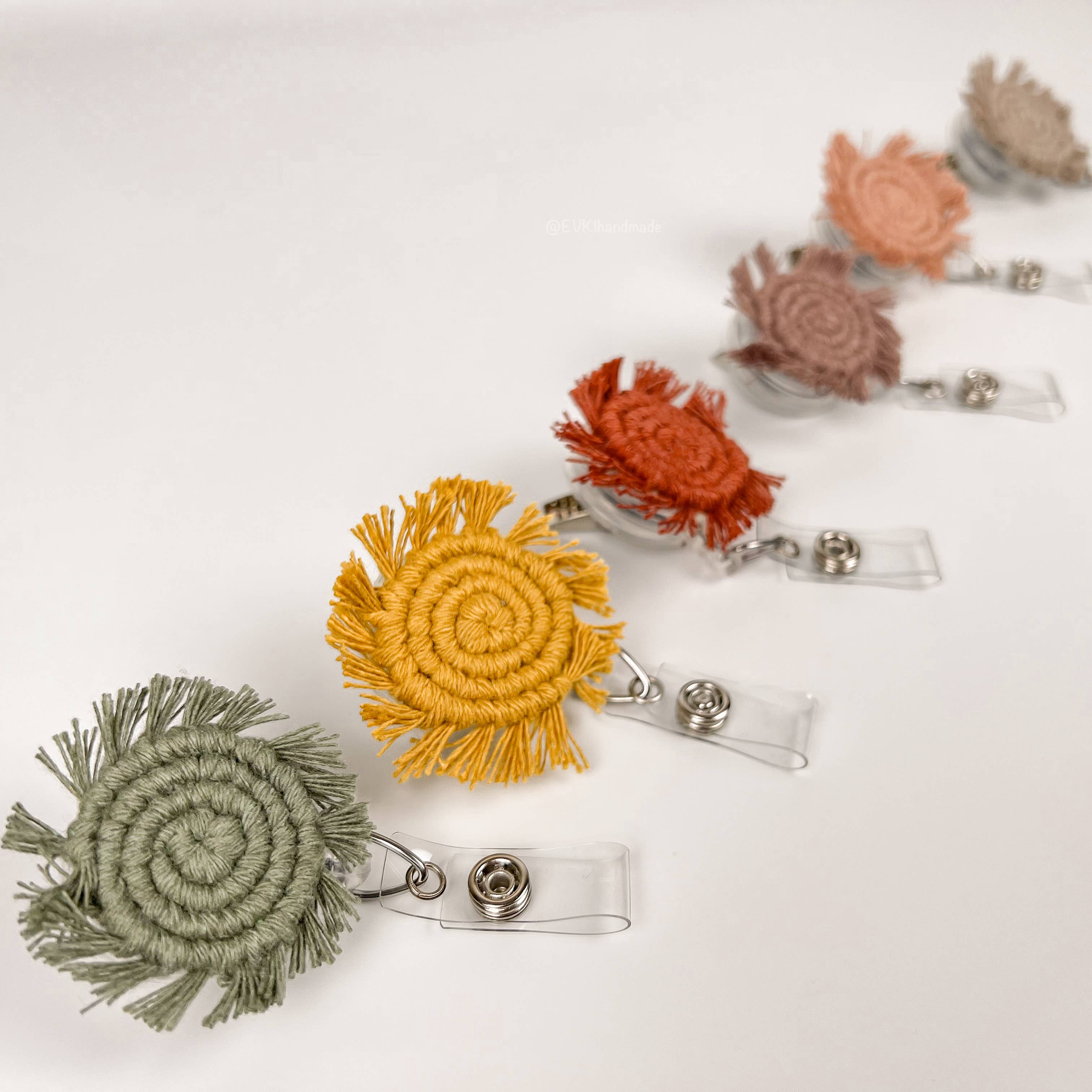The cutest boho addition and pop of color to hold a ID badge. SIZE -1.75" wide by 2" tall including fringe -Cord length: 34" *Due to its handmade nature, sizes are approximate MATERIALS -100% recycled cotton cord -Alligator swivel Clip -Vinyl Strap Clip **Handmade to order ***Each rainbow is handmade individually and no rainbow is exactly the same ****Product colors may vary from what you see on screen due to different monitor settings and lighting