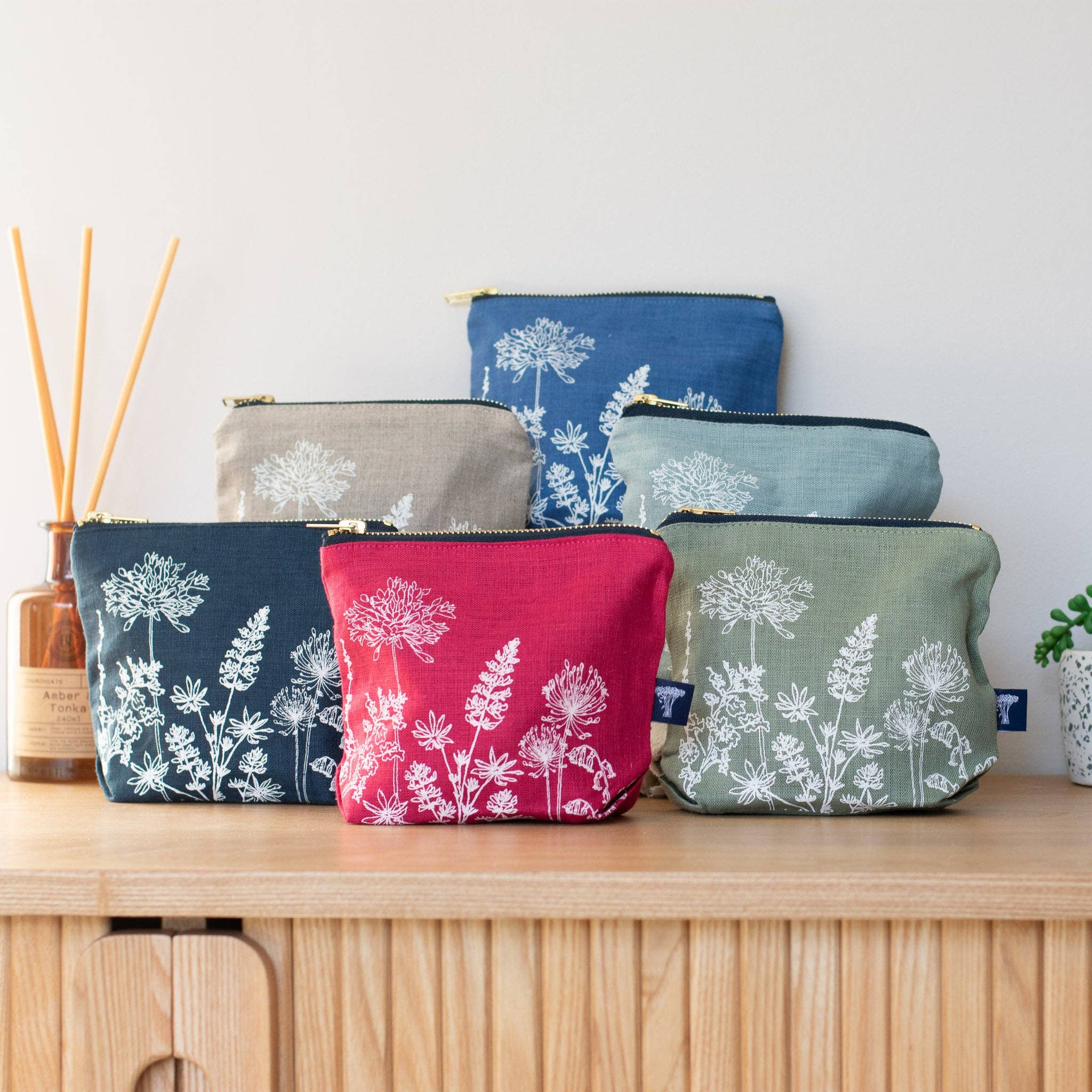 A lovely linen makeup bag hand printed with the garden design. The perfect size to keep all of your make-up essentials together. Ideal for handbags and overnighters, and big enough for keeping all your cosmetics in one place! This beautiful linen makeup bag has a classic dark navy, soft waterproof lining and a brass zipper. Hand printed and made in Cornwall, the makeup bag is available in the following beautiful linen colours:- - Natural - Indigo - Duck egg blue - Raspberry red - Sage green - Navy Machine washable at 30 degrees. Measures approx: 17 x 14.5 X 6 cm 6.7 X 5.7 X 2.3 Inches Co-ordinate or match with our linen toiletry bag also in the garden design. About the garden collection – this linen makeup bag is hand screen printed with a design that is inspired by the cottage garden flowers that grow in Helen’s garden.