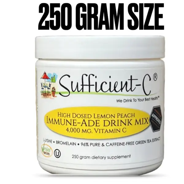 125 gram TAKE-IT-ALONG-SIZE - Vitamin C is the foundation of health, but ample vitamin C must be consumed every day, throughout the day to actually build that strong foundation. Unfortunately, ingesting large amounts of vitamin C can be daunting for most and even more so when one's immune system is begging for extra support! Sufficient-C® High Dose Vitamin C Lemon Peach Immune-Ade drink mix offers a refreshing combination of real plant based flavors with a premium blend of 4,000 mg. non-GMO vitamin C ( 2,000 mg. per scoop ), L-lysine, Bromelain and a 94% pure green tea extract in a satisfying, thirst quenching drink mix! Nothing about Sufficient-C® is hard to swallow! Now you can obtain the effective, year-round immune support you need and the sweet, satisfying flavor you crave! Non-GMO • Gluten-Free • Vegan • Sugar-Free • Plant-Based • Stevia Sweet!