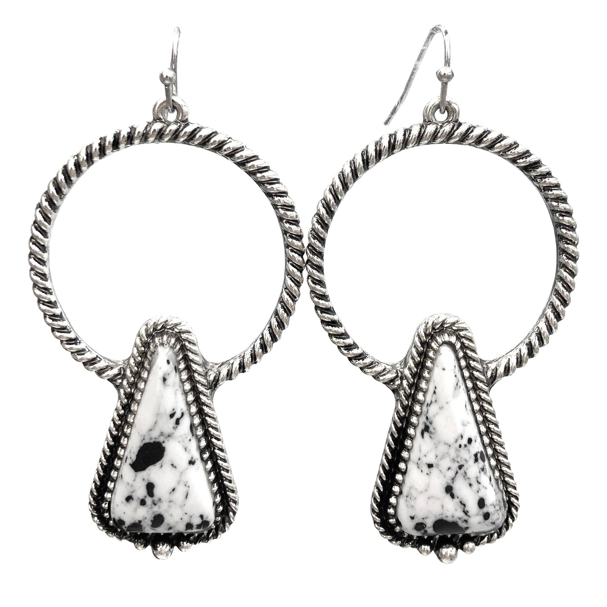 Introducing the Howlite Cross Navajo Pattern C Hoop Earrings, a stylish and unique addition to your jewelry collection. These earrings feature a beautiful combination of a criss on a Navajo-inspired pattern, making them a perfect accessory for any boho or Western-inspired outfit. Lead and nickel compliant. Adults only.