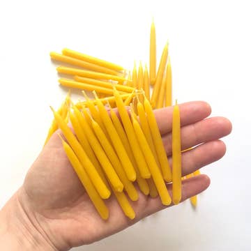 Product Details: • Quantity: 44 beeswax Chanukah candles • Size: 5.5 in x 0.9 cm diameter • Material: Pure beeswax. Cotton wicks. • Packaging: Sturdy cardboard box featuring an original label inspired by the candle boxes of your childhood with a modern edge. • Burn time: 60-70 minutes Elevate your Chanukkah celebration with our handmade beeswax Chanukah candles. Handcrafted with all-natural beeswax, each candle provides a clean & consistent burn. The warm, golden glow of these candles will fill your home with the spirit of the Festival of Lights. Bring warmth, radiance, & serenity to your Chanukah celebrations with our pure beeswax candles, an essential addition to your holiday traditions. Beeswax candles burn longer, emit a soft, warm light, & cleanse the air with negative ions. Plus, say goodbye to messy drips! Trim wicks to 1/4". Never leave unattended.