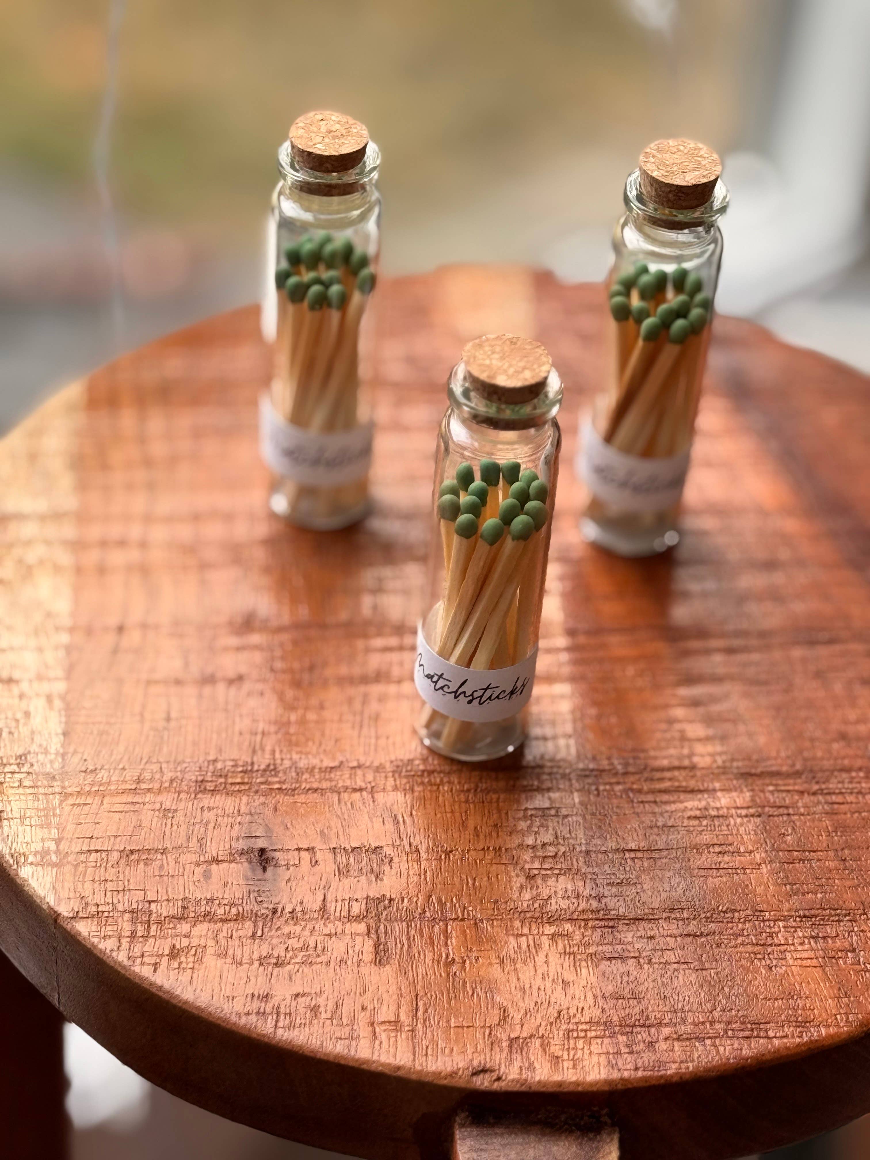 Matchsticks in glass vial with cork top, strike on bottom finished off with a label. Perfect for gift boxes, camping, and household items. Set of jars filled with 15-20 matchsticks each.