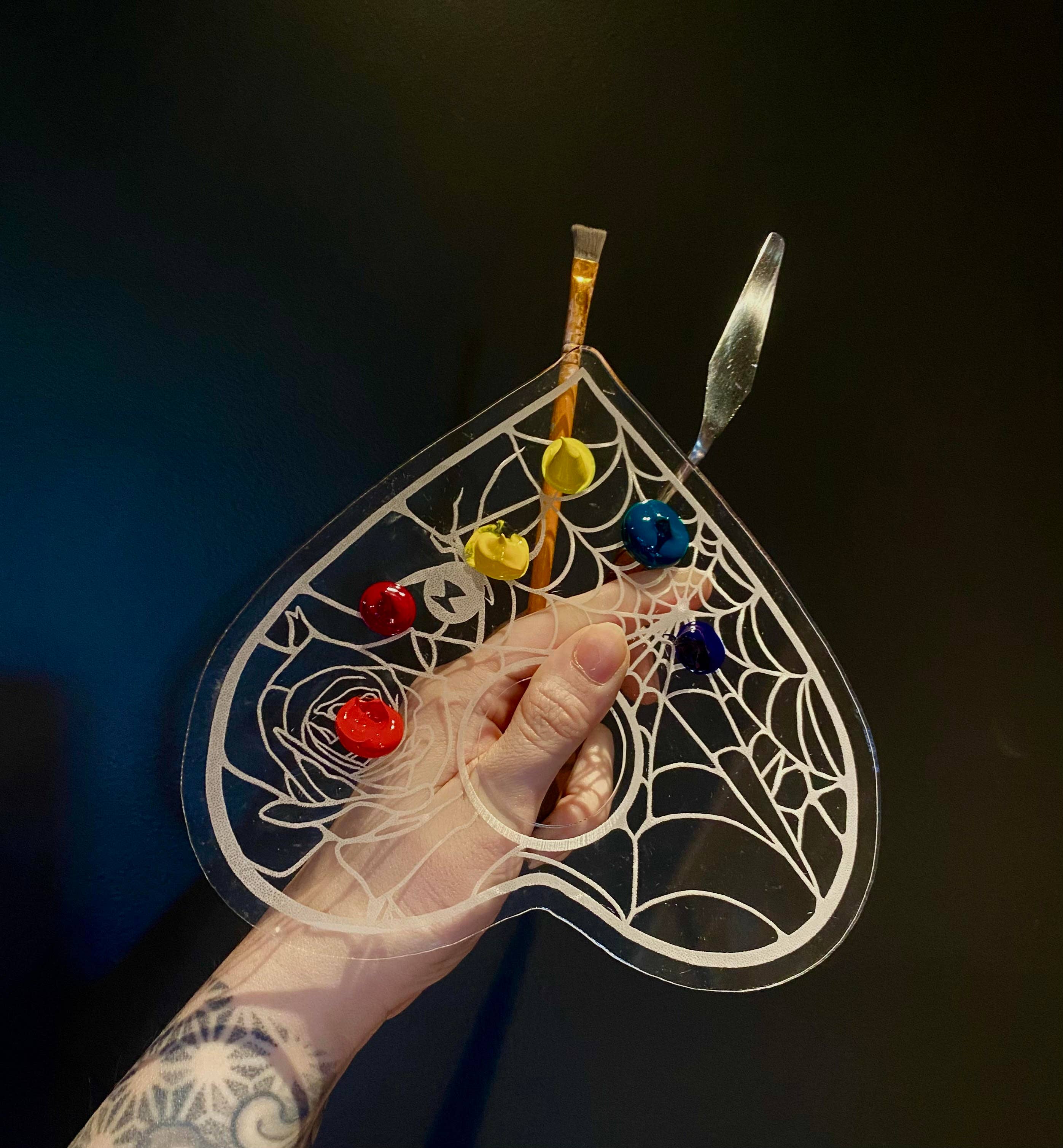 Paint your heart out with this reusable custom palette! Designed by artist Suzy Berhow, each palette is then engraved in cast acrylic. Wash and reuse! When not in use it makes a lovely piece of art on the wall!
