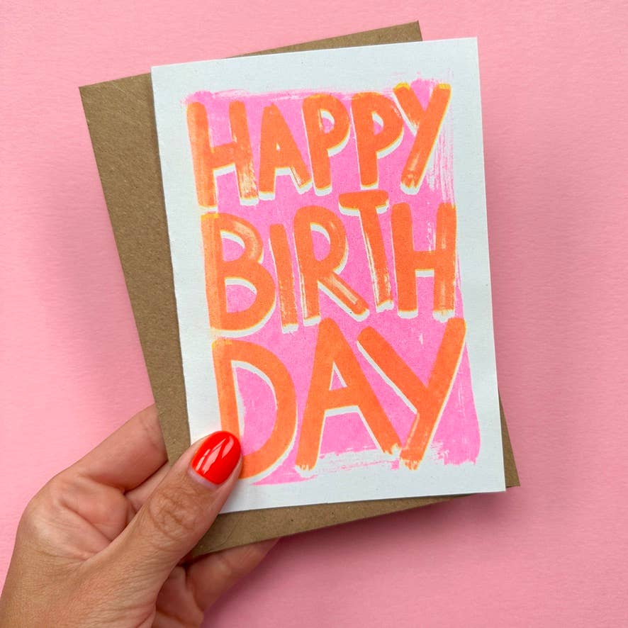 Happy Birthday Risograph Greeting Card in Black and White with bold hand painted typography. Left Blank inside for own message. About Riso Printing Riso printers have little impact on the environment as they use non-toxic ink that is cold pressed. Each print is unique with an interesting spot texture. Similarly to screen printing they have lots of character and print one colour at a time using a stencil. Inks can smudge slightly if handled a lot, (a bit like newspapers) so we like to wrap in a biodegradable sleeve for extra protection. Printed onto 100% recycled 300gsm FSC card. Packaged with 100% recycled brown envelopes and a biodegradable sleeve.