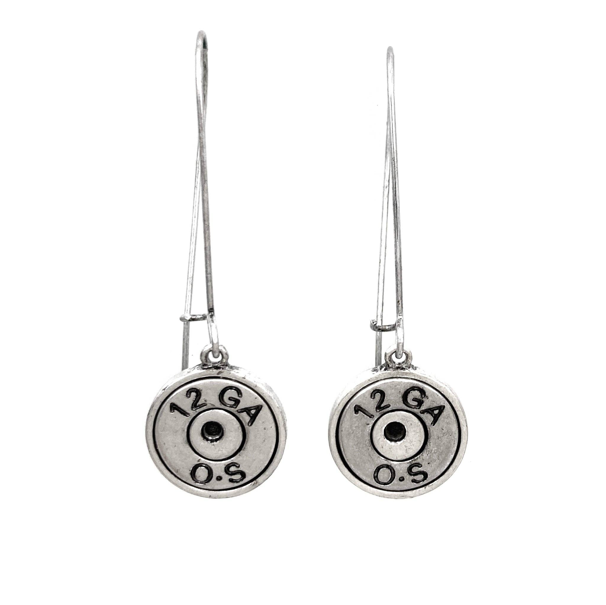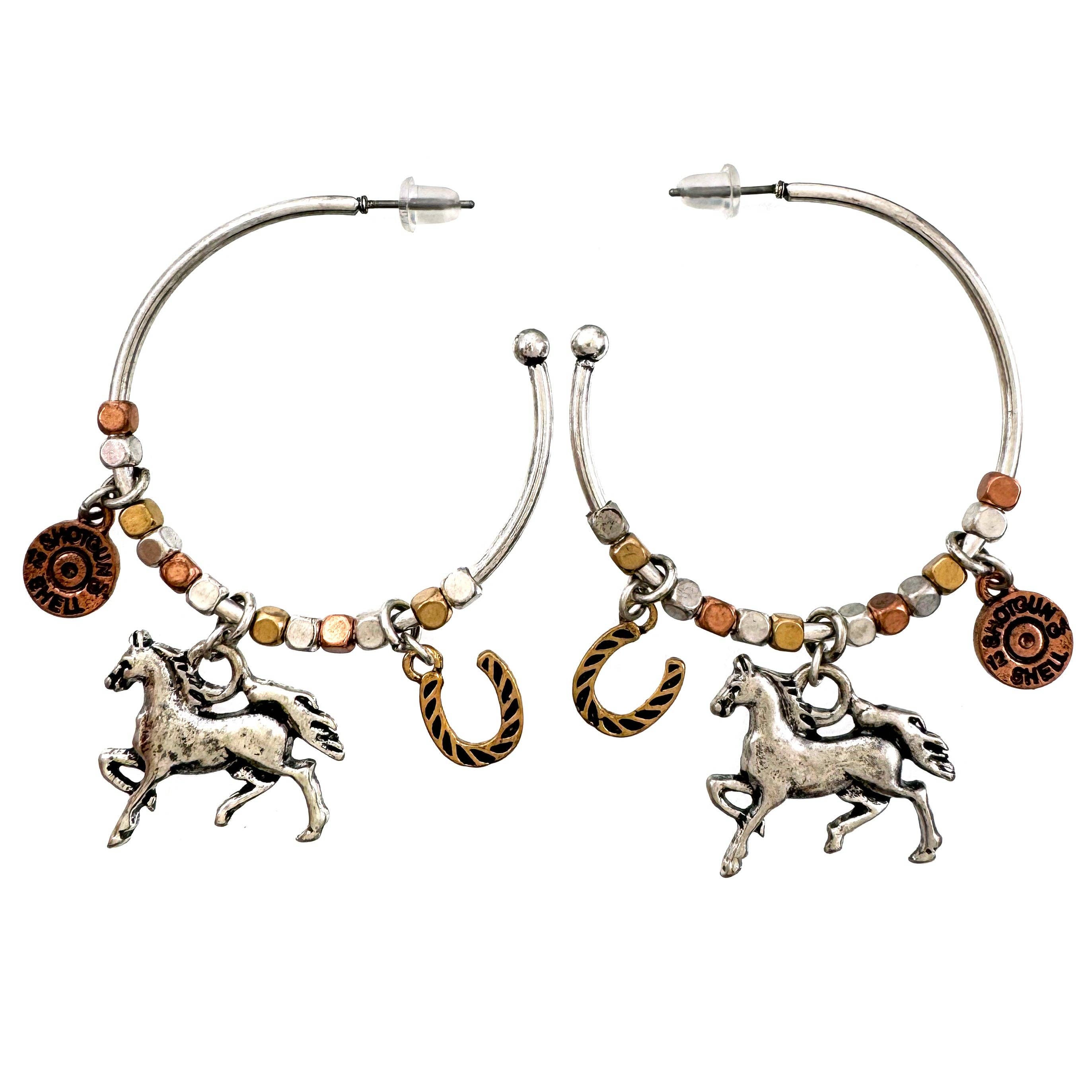 Bullet Shell Cowboy Cactus Western C Hoop Earrings. Beautiful C Hoop Earrings with western charms consisting of a 12 GA shotgun bullet shell, cowboy rider, and cactus with rustic metal beads. Lead and nickel compliant.