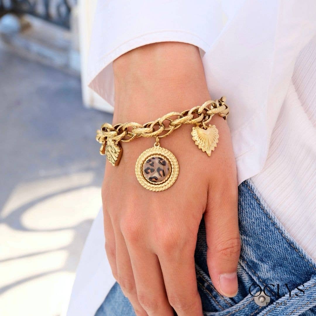 Original half-bangle, half-band bracelet, combining a hammered gold stainless steel part for an elegant textured effect, and a leopard print faux leather band for a bold and fashionable touch. A contrasting and trendy piece of jewelry, perfect for asserting one's style. Hypoallergenic, free of nickel, cadmium, and lead. Lightweight, comfortable, and durable: ideal for shops looking for contemporary costume jewelry with strong personality.