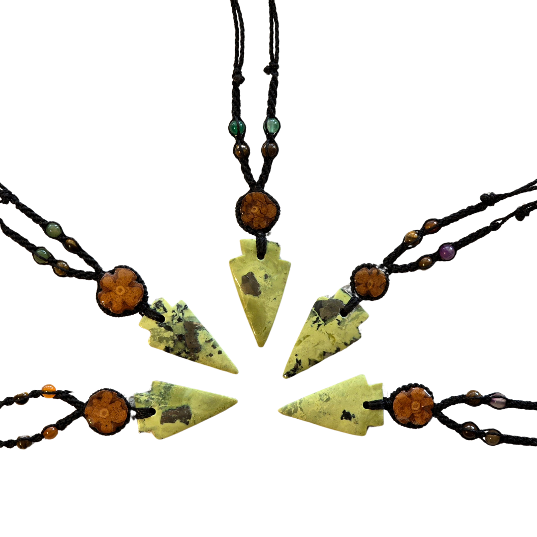 This elegant boho-style necklace features a sodalite centerpiece, lacquered cross-section of the ayahuasca vine and various smaller stone accent beads embedded in a fancy macrame waxed thread design. Ayahuasca is used by many Amazon shamans in traditional ceremonies. Each necklace has a waxed twine with two knots that allow easy adjustment of the length to fit it over your head and then tighten. The necklaces were made by expert artisans from Iquitos. Please remember that each stone piece is unique so the pattern will vary from the one featured in this product's main photo. Model: NK152P32