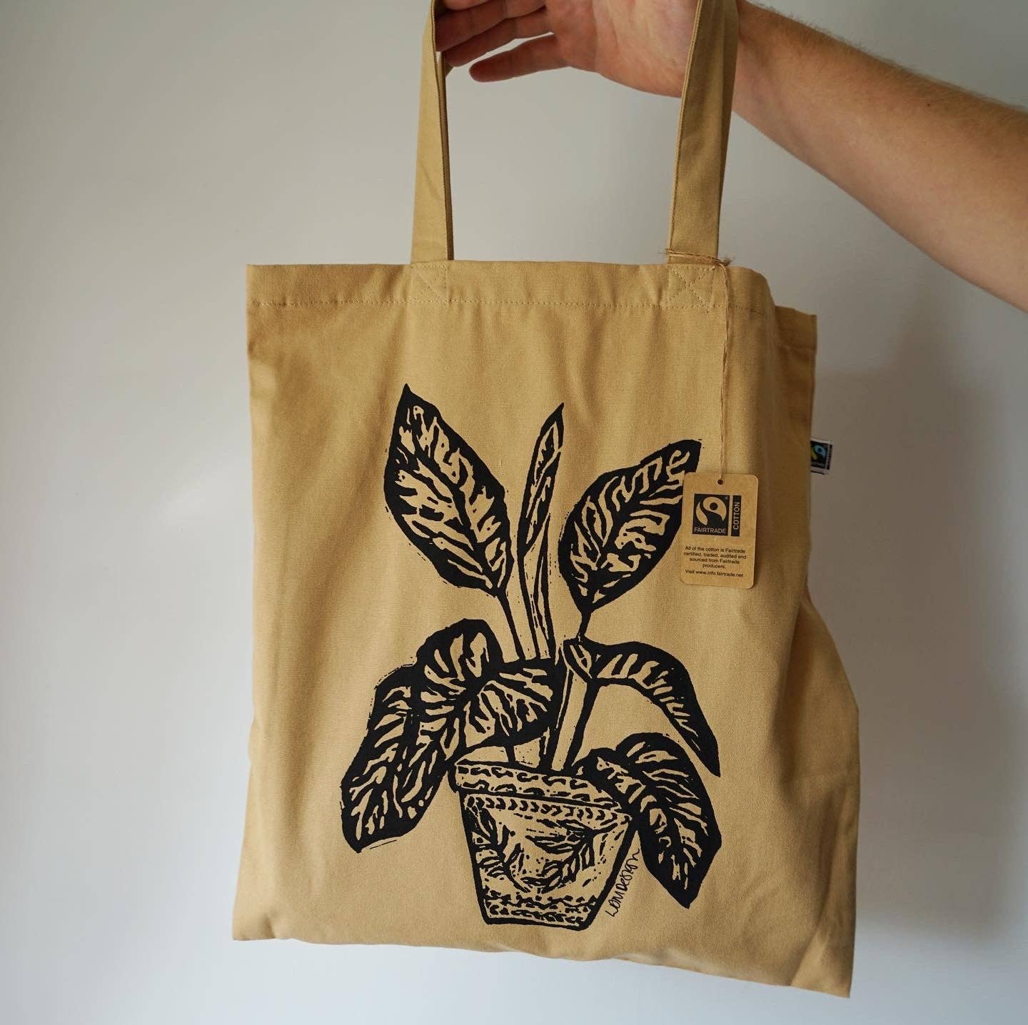 Eco-Friendly recycled plastic RPET Monstera Deliciosa tote bag. The tote bag is a lushes cardamon green colour and features a black linocut design of the popular house plant Monstera Deliciosa or Swiss cheese plant. Made from recycled plastic bottles, this bag is a stylish and sustainable way to carry your belongings. This stylish lightweight RPET Luxury Shopper bag is made from recycled plastic which has been diverted from ending up in the ocean or landfill. A timeless classic integrated with ethical production. RPET Tote Bags are the promotion to a circular way. The bag is the perfect size for use as a luxury shopper or everyday tote, with ample space to carry all of your essentials, Whether you're heading to the beach, running errands, or simply out and about, the durable RPET material means that this bag is built to last, and can withstand the wear and tear of daily use. * Cottonfeel rPET * 5oz * Long Handles: 600mm / 24in * Wipe clean only * Made from RPET Fabric * Screen printed in the UK