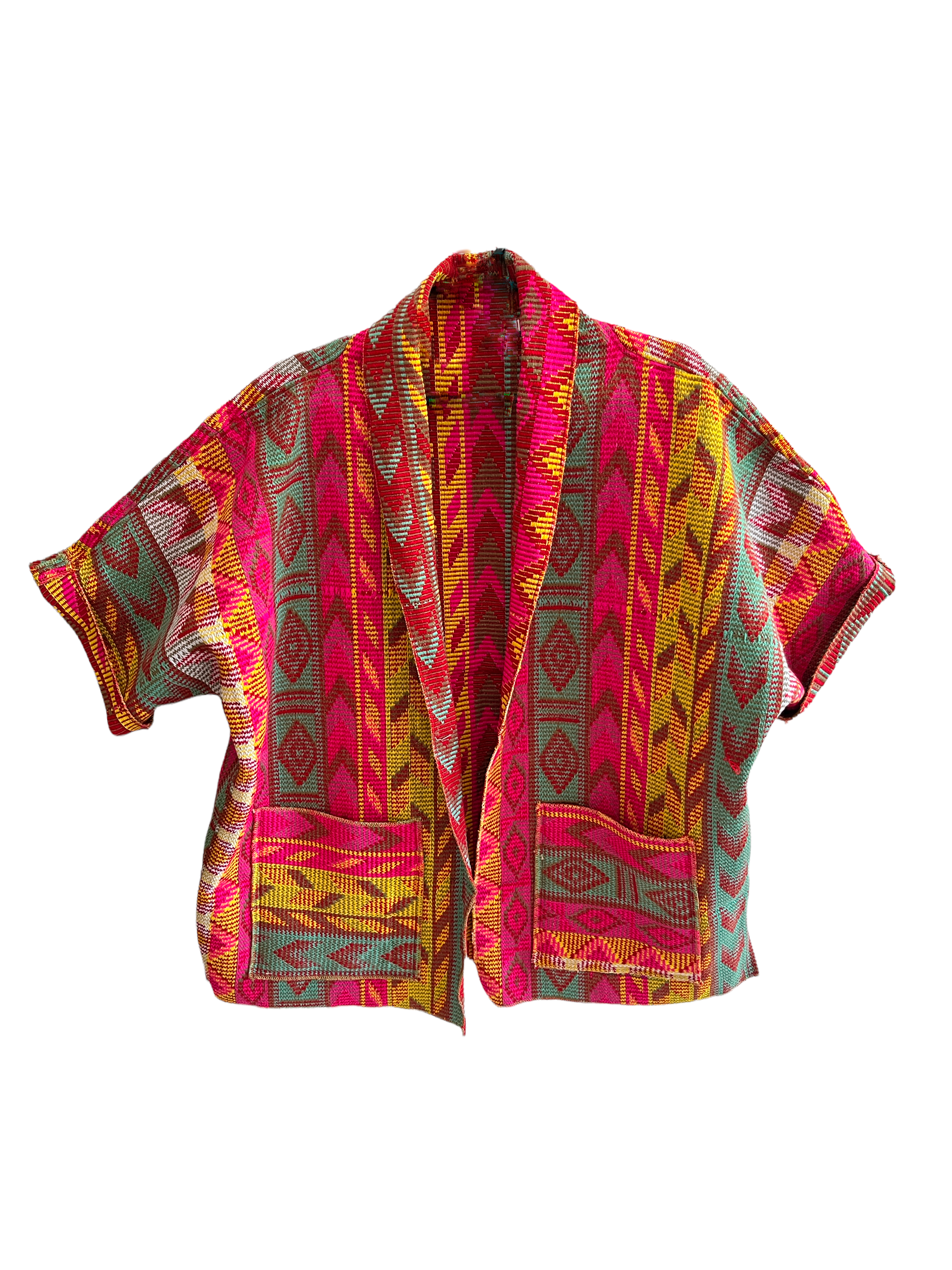 Beaded envelope clutch with a stamp design and a beaded wristlet handle. With a raw silk base, cotton lining, metal zipper, and magnet snap. Handmade. Dimensions: 7 inches height x 10 inches length; with a beaded wristlet with a 3.5-inch diameter. Materials: 1) Glass beads; 2) Sequins; 3) Thread embroidery; 4) Raw silk base; 5) Wood wristlet with bead cover; 6) Cotton lining; 7) Metal zipper; 8) Magnet snap.