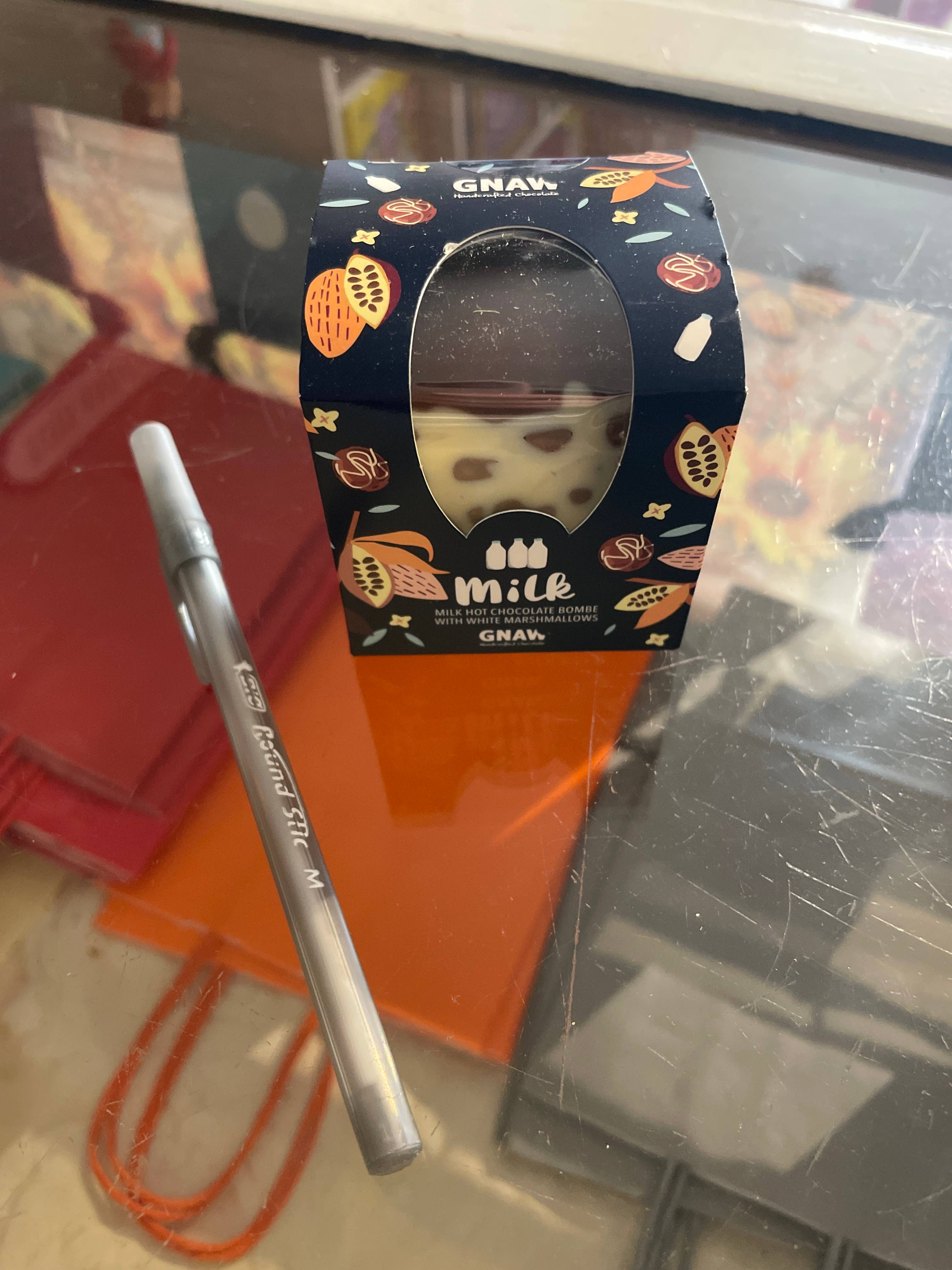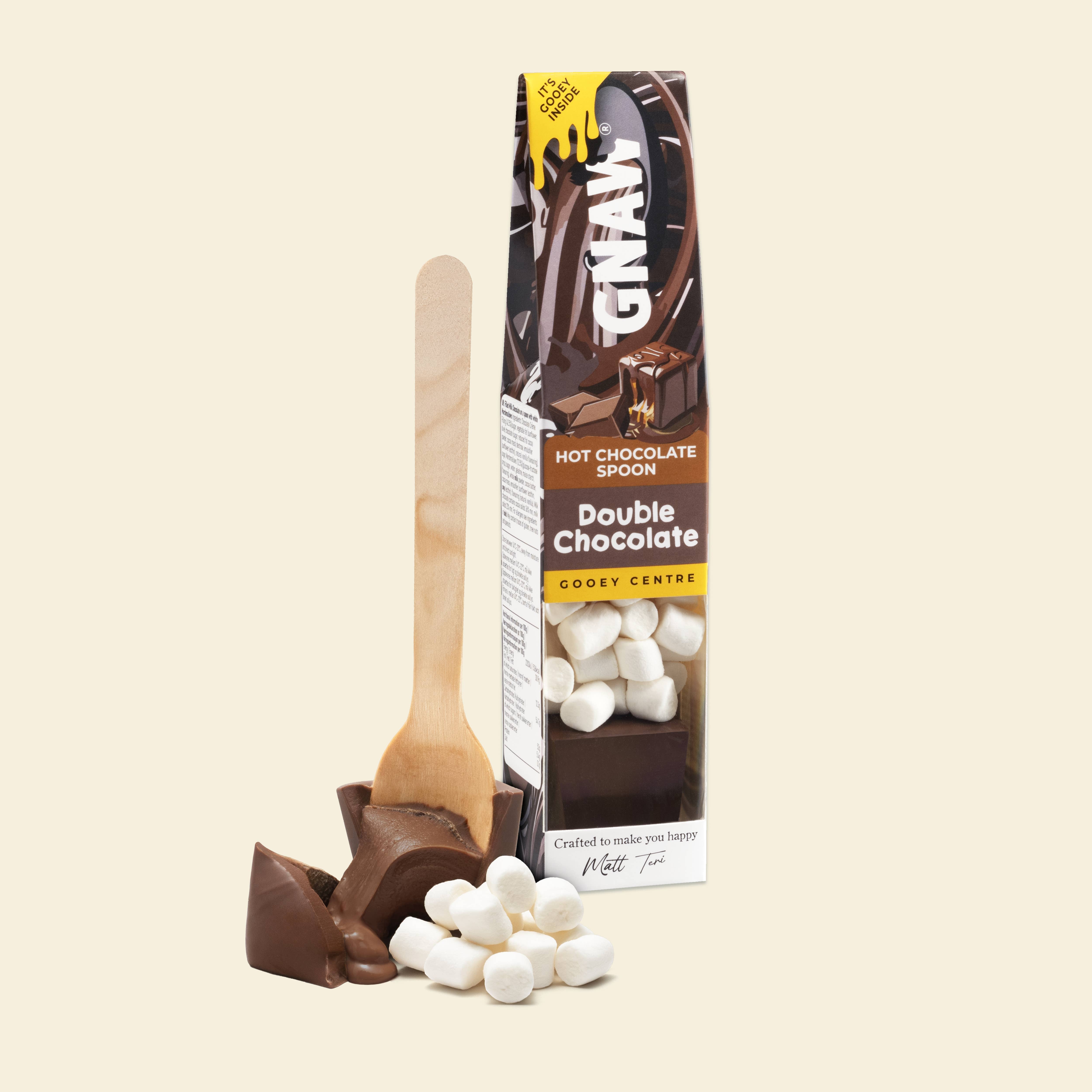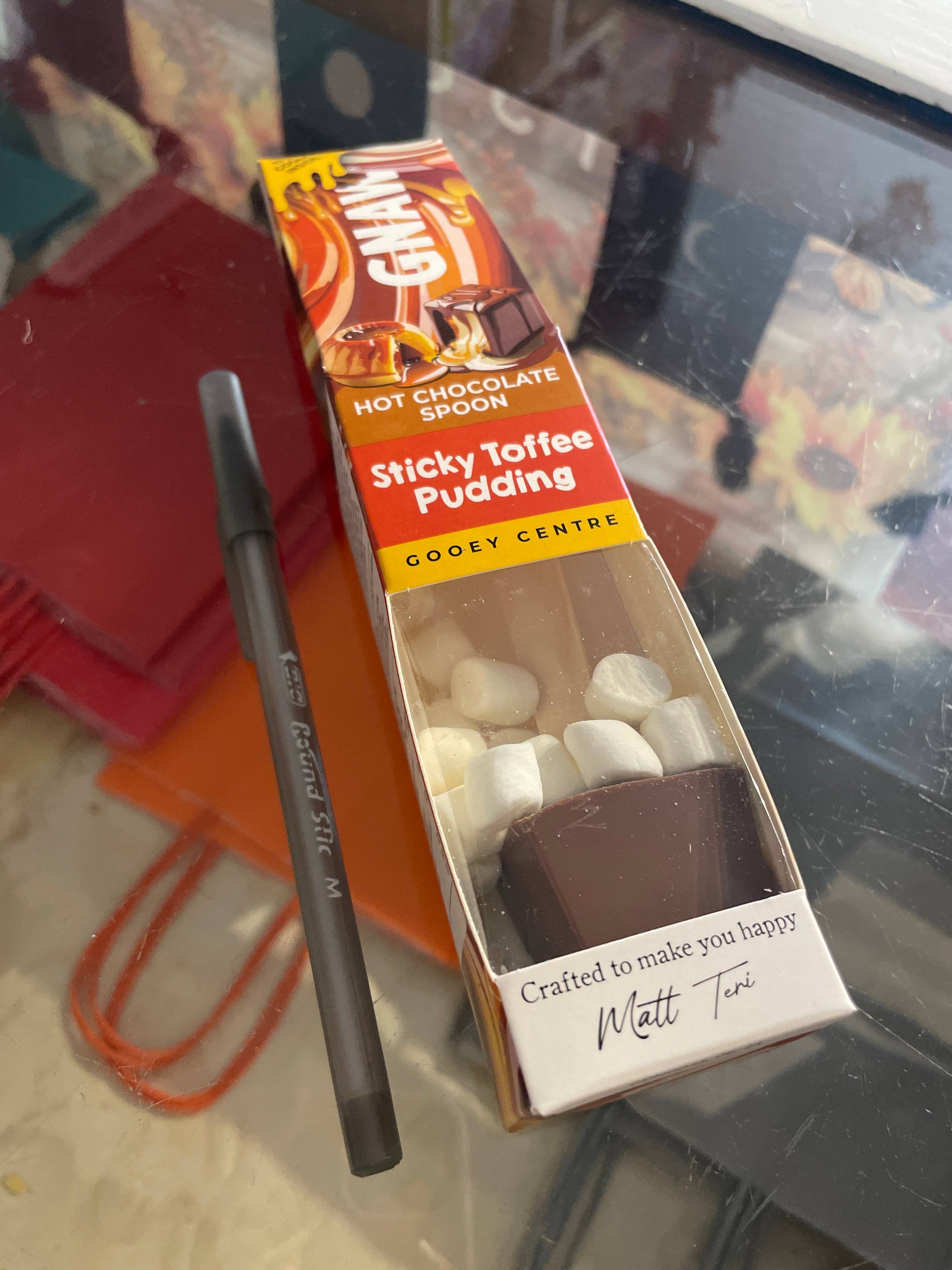 Luxurious Sticky Toffee Pudding Hot Chocolate Have a hug in a mug with Sticky Toffee Pudding Soft Centre Hot Chocolate Spoons. Simply fill your favourite mug with hot milk, stir the gooey centre spoon, and watch as the warm, buttery toffee flavour and chocolate melt into a creamy, indulgent cup. Contains: 1x 40g GNAW Sticky Toffee Pudding Gooey Hot Chocolate Spoon with Marshmallows.