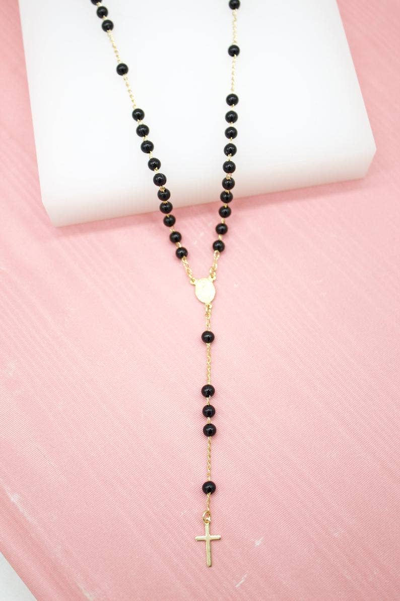Description: * Material: 18K Gold Filled * Quantity: 1 Chain 1 Clasp (As Pictured) (Bulk Orders Accepted) * Length: 17 1/4' Inch * Chain Type: Curb Chain With Beads * Chain Thickness: 1.17mm * Bead Size: 3.19mm * Pendant Size: 13mm x 7mm (Cross) * Charm Size: 6mm x 8mm (Virgin Mary) * Color: Gold