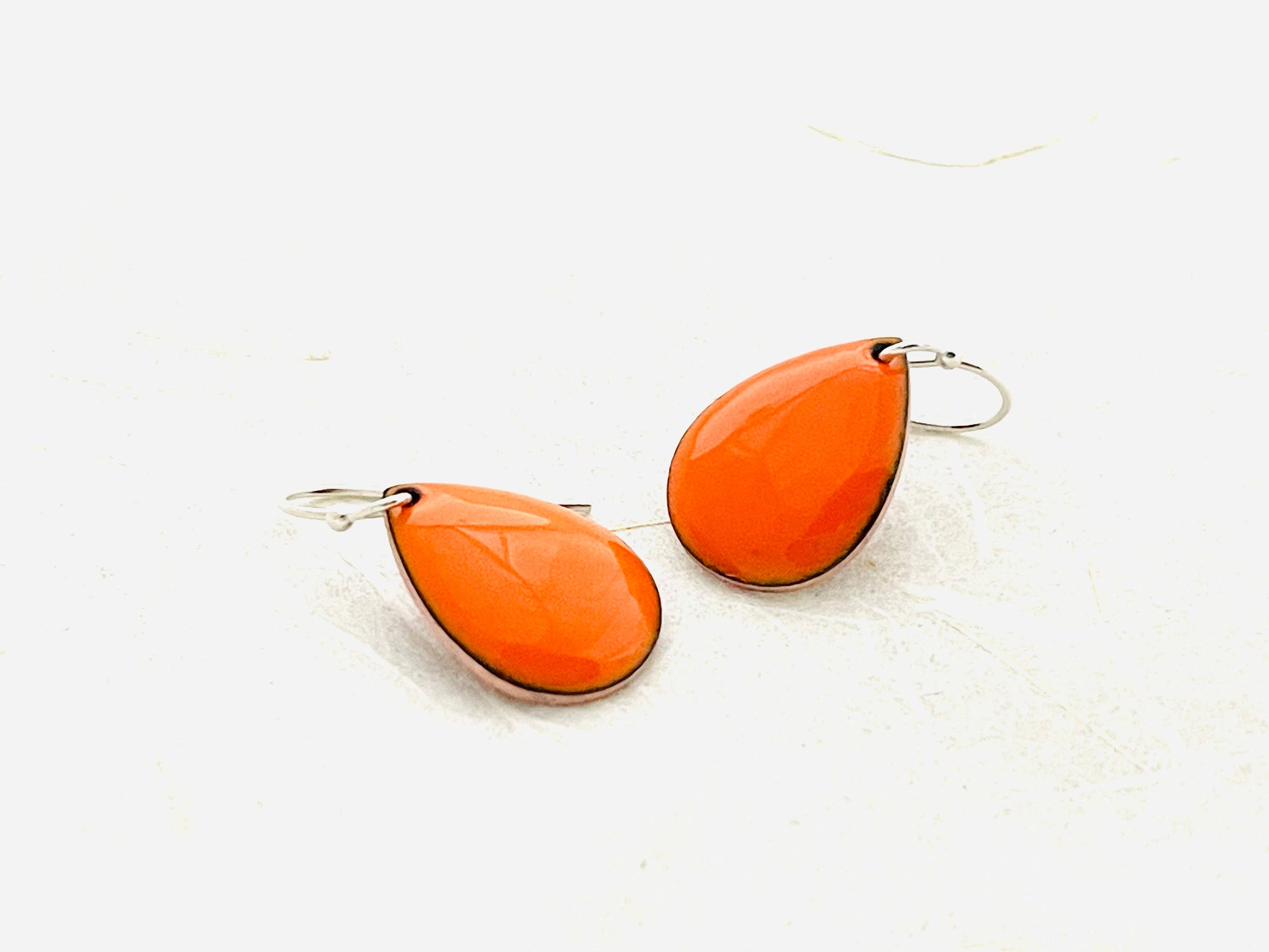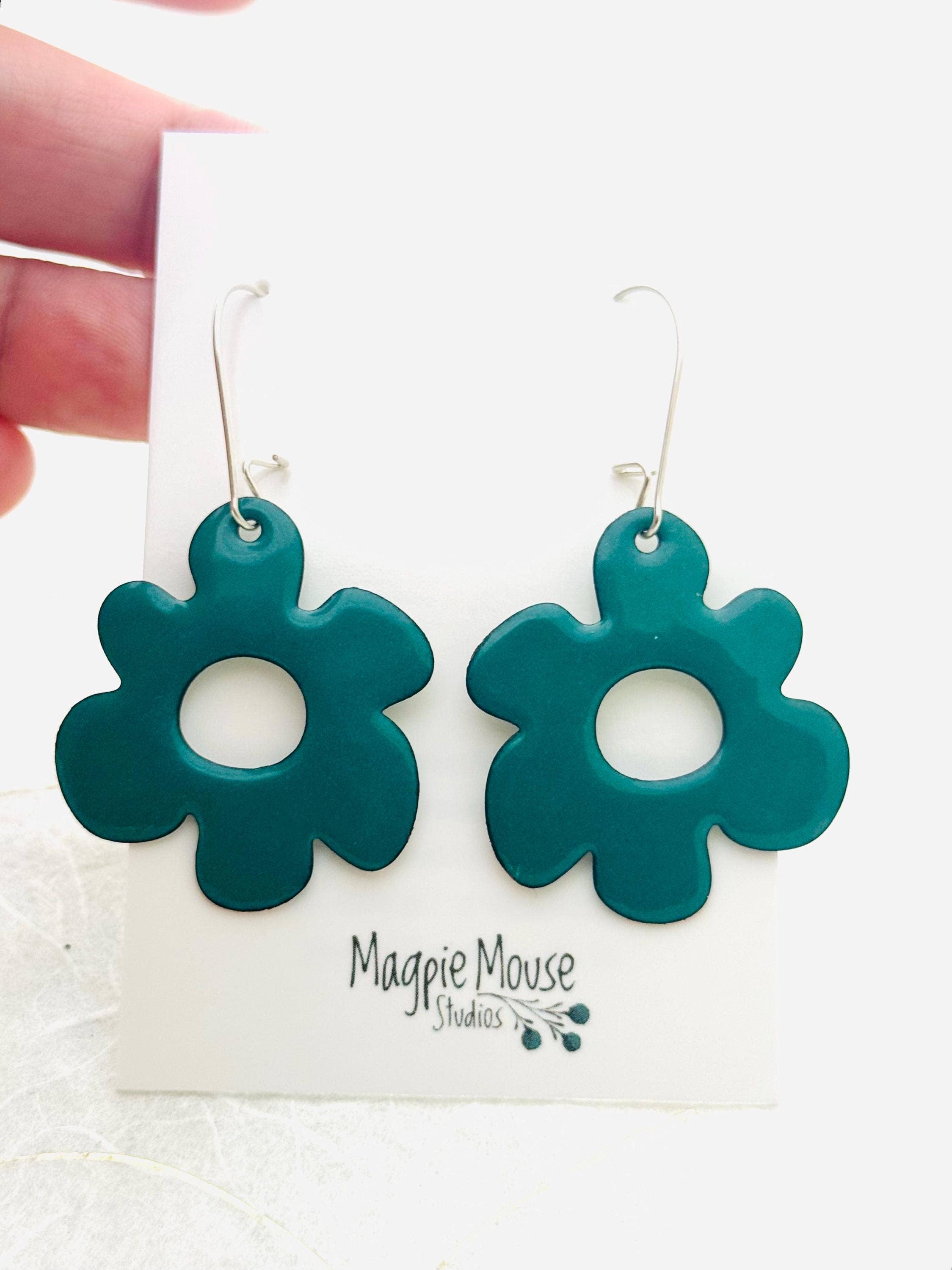 Fun enamel earrings with a retro twist. These earrings start as copper and have 4 layers of fused glass. The enamel flower measures 1 1/4 inches and include a drop earwire marking the hang-length 2 inches. Includes sterling silver earwires. Handmade at Pike Place Market. Seattle, Washington.
