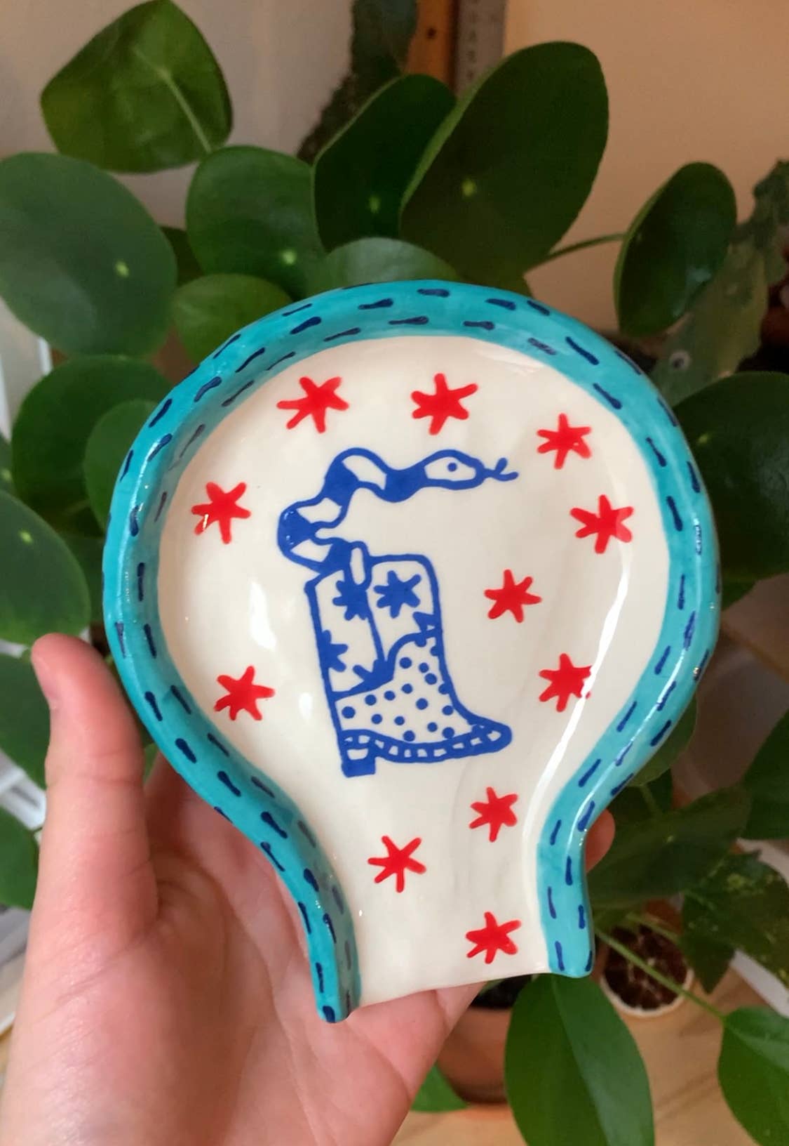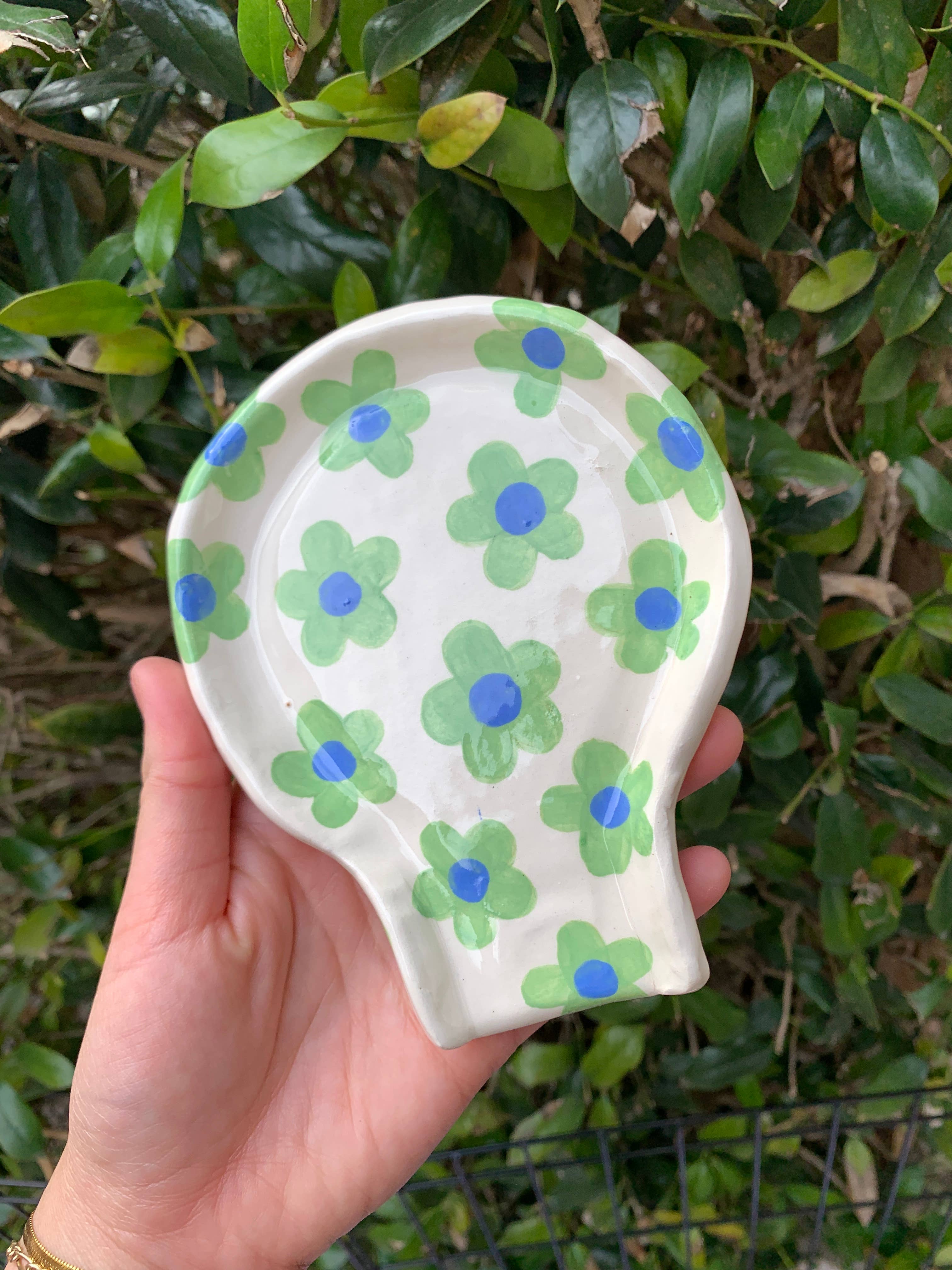 Cute lil ceramic spoon rest to help keep your kitchen clean & cute! Hand sculpted & painted by me, CR, in good ol' Texas, yee-haw (-: Dishwasher safe but I recommend hand washing to make sure your piece lasts extra long!