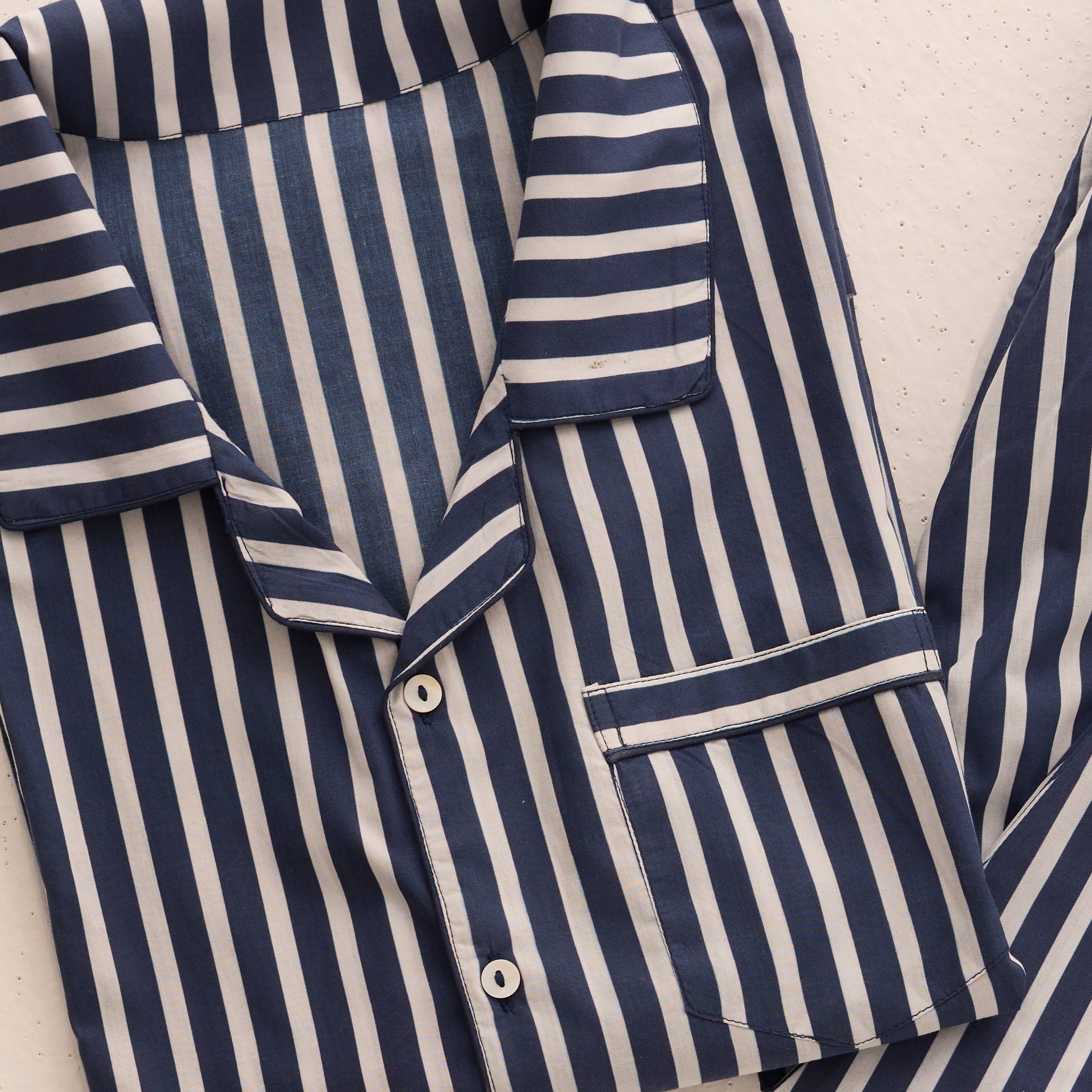 Add a dose of style to your bedtime with our ultra-soft pima cotton pajama set, designed with refreshing coastal stripes. Includes a super-soft top and coordinated pajamas, with contrast cording Soft, elastic waist on the pajamas Option to personalize on the pocket of the top Beautifully packed in our matching fabric gift bag (ready for gifting!) Fabric * 100% pima cotton Size * Sizes available from XS-3XL Care: * Machine wash in cold, gentle cycle or dry clean * Do not soak * Tumble dry on low heat; remove promptly * Warm iron as needed * Do not use bleach or softners