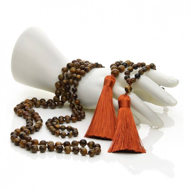 Knotted jasper necklace made with 6 mm beads. This necklace model is available in dalmatian jasper and paisana jasper. Each of the two options consists of a beautiful necklace of authentic jasper, made with 6 mm diameter beads separated by a refined knotting work. The dalmatian jasper necklace is knotted with pearly white thread while the paisana jasper one uses red thread. In both options, the color of the small knots contrasts with the stone, giving the necklace liveliness and elegance. The average size of each necklace is about 84 cm in circumference. The price is per unit.
