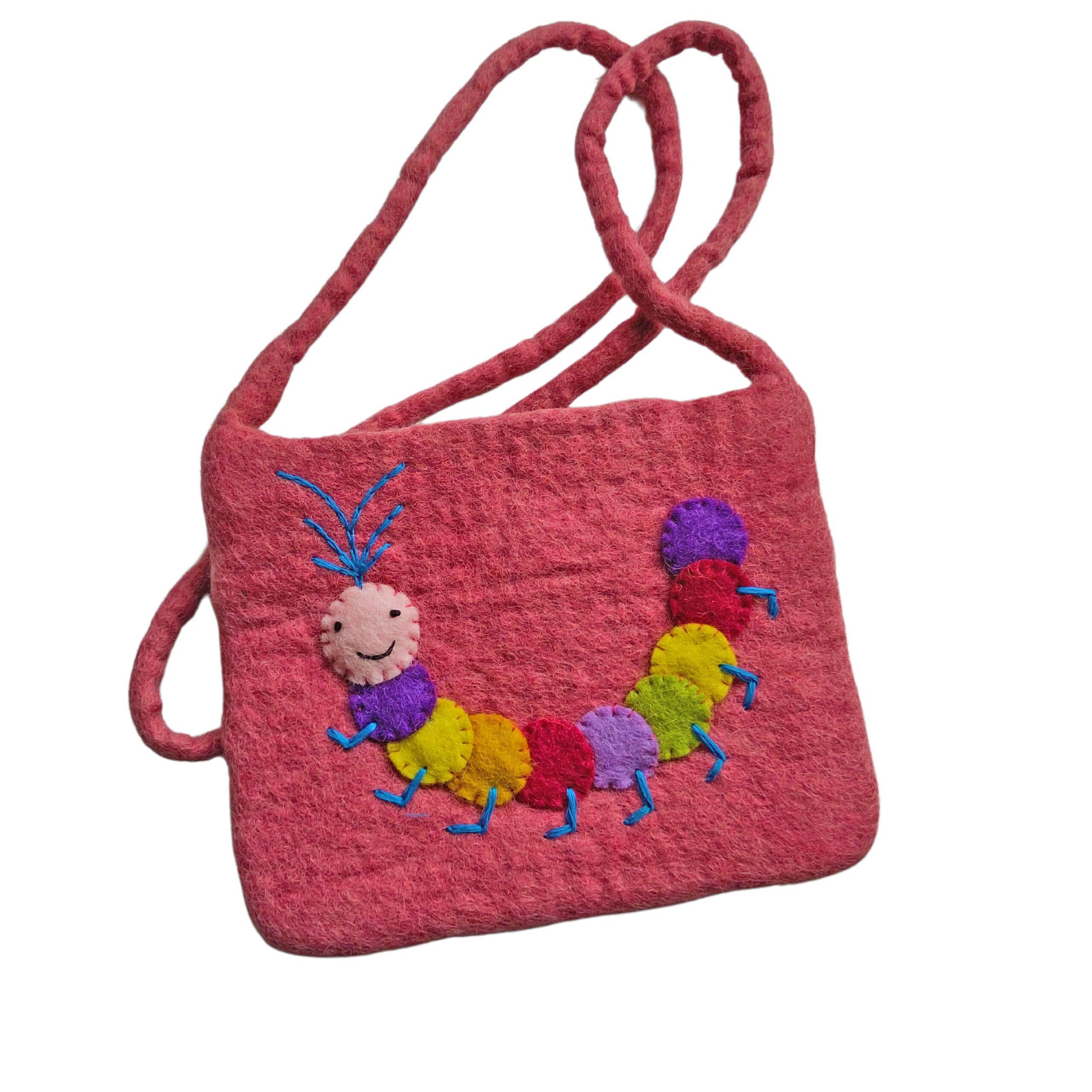 An unusual shoulder bag in the shape of a flamingo, with a flamingo finger puppet. The bag is 28cms beak to tail, and 16cms to the highest point of the duck's head. The strap is 90cms long. There is a zip fastening and black cotton lining. Hand made in Nepal under fair trade conditions from 100% wool felt.