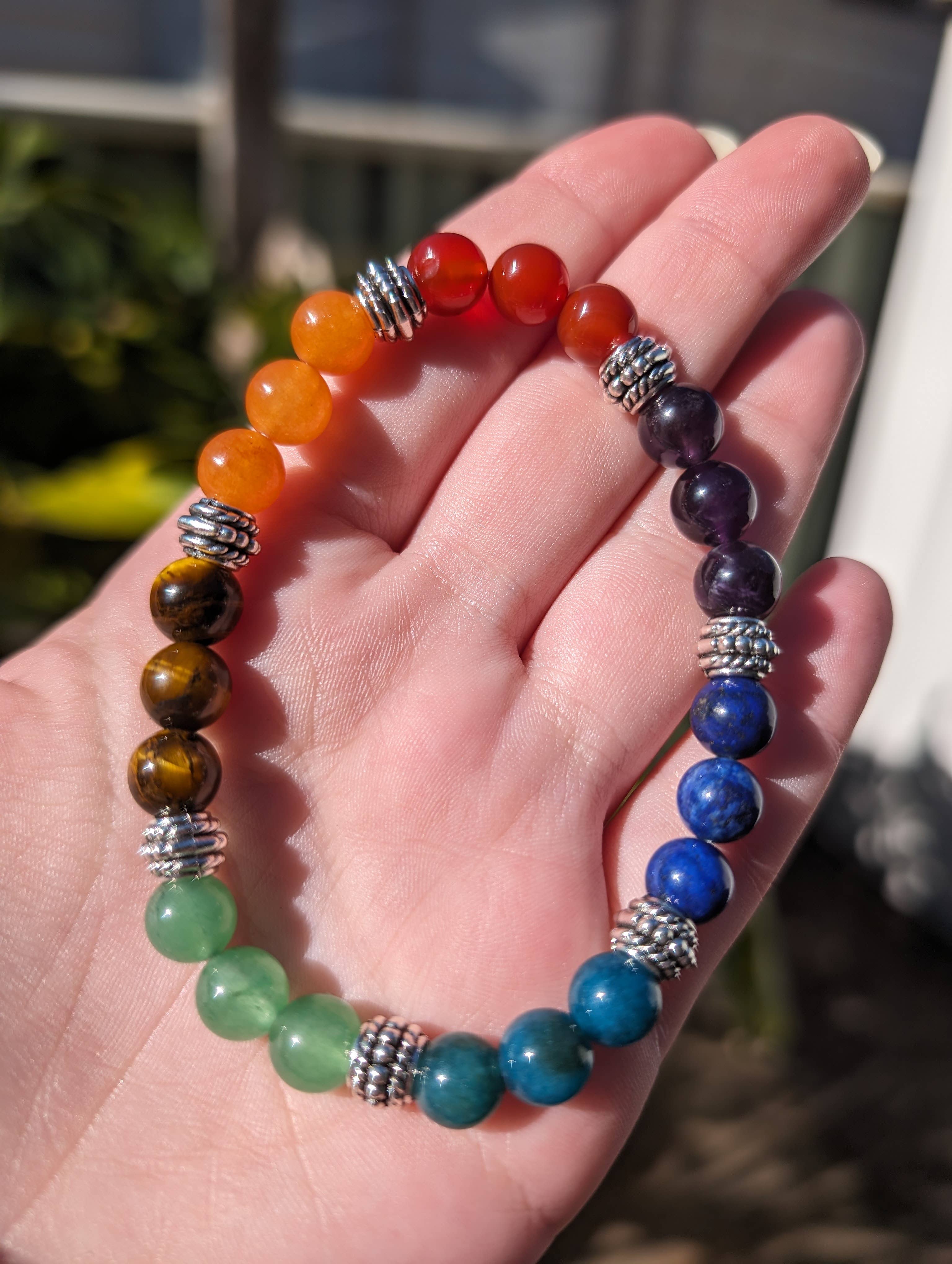Chakra stretchable bracelet made with 8mm sized beads. *Double strung for durability. *All natural semi-precious gemstones. *7.75-8 inches in length. *Gemstones used for Chakra: Amethyst, Lapis Lazuli, Blue Apatite, Green Aventurine, Yellow Tiger Eye, Orange Calcite, and Carnelian. This picture is an representation of the type and quality of the gemstone you will be receiving. As you know, there are slight variations due to the natural character of this product.