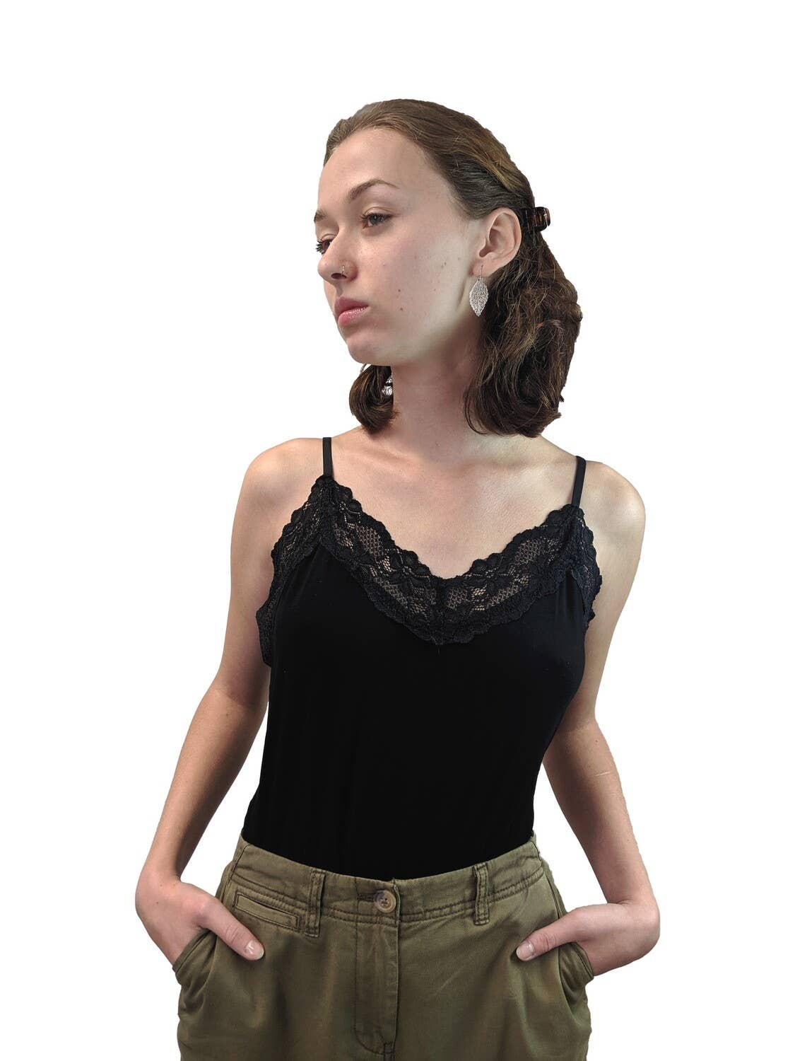 *Plus Size Style#CJC1509X* -Double Drape -Ruffle -Cami -Solid Top -Spaghetti Strap -V Neck -Eyelet -96% Polyester 4% Spandex -Imported. Designed in USA.
