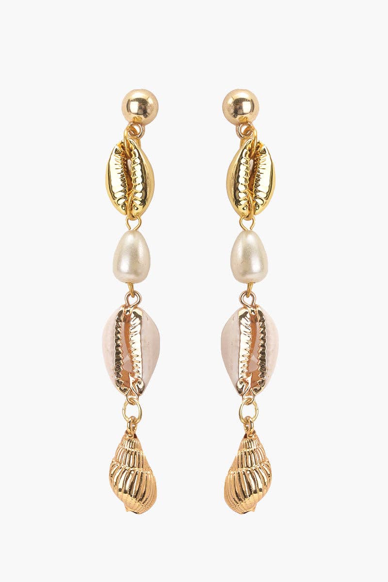 * Handmade beaded earrings featuring precious shells. * Accented with bead fringes, multiple shells, and semi-precious golden stones. * Finished with a secure jump ring and back pin attachment. * Handcrafted in aqua and natural tones. These aren’t just earrings—they’re a whole mood. Handmade with love, these precious shell stunners are rich in detail: from playful bead fringes to layered natural shells, finished with a semi-precious golden stone for a touch of luxe. Secured with a sturdy jump ring and back pin, they’re handcrafted in dreamy aqua and natural tones—radiating tropical goddess energy without the humidity. Light enough for all-day wear, bold enough to turn every head.