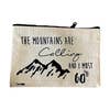 An illustration of Mountains and a small snipit of the popular John Muir quote "The Mountains are Calling and I Must Go". Carry your essentials during the day in this 5”x7” zipper pouch that features our ‘And I Must Go’ illustration. Great for makeup, toiletries, change, pens & pencils, snacks and more! The illustration is screen printed on the 100% cotton canvas zipper pouch. Designed and printed in the mountains of Montana. Small batch made.