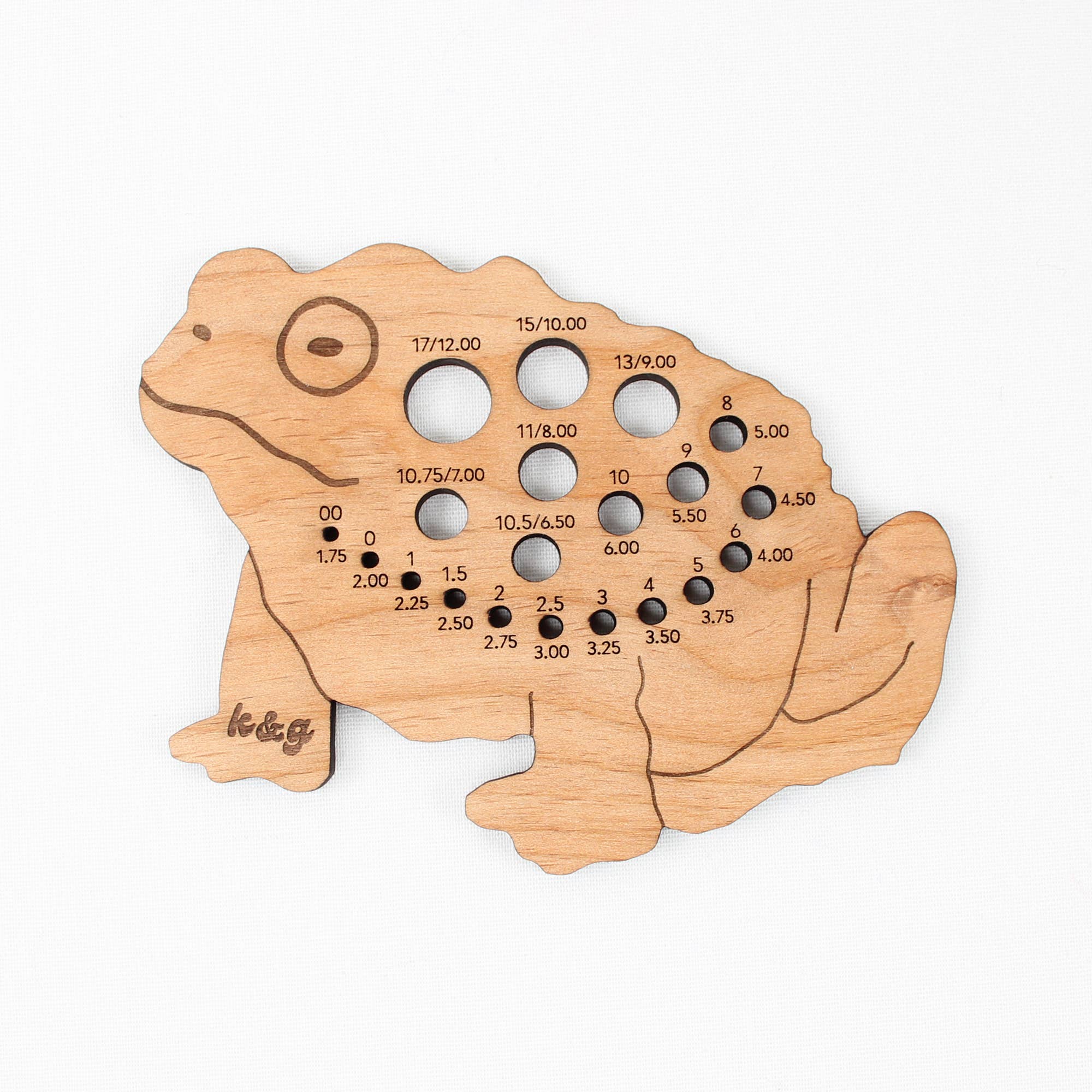 Now in toasty Alder wood! A multifunctional gauge tool that has knitting needle and crochet hook measuring on the cap and a 2 inch project gauge window on the stem. This gauge tool has purpose and a fun original design! Measure knitting needles and crochet hooks with sizes starting at 1.75 mm up to 12 mm. Designed and made in Minnesota, sealed with natural wood oil for lasting quality. A must have for every project bag or fiber tool kit.