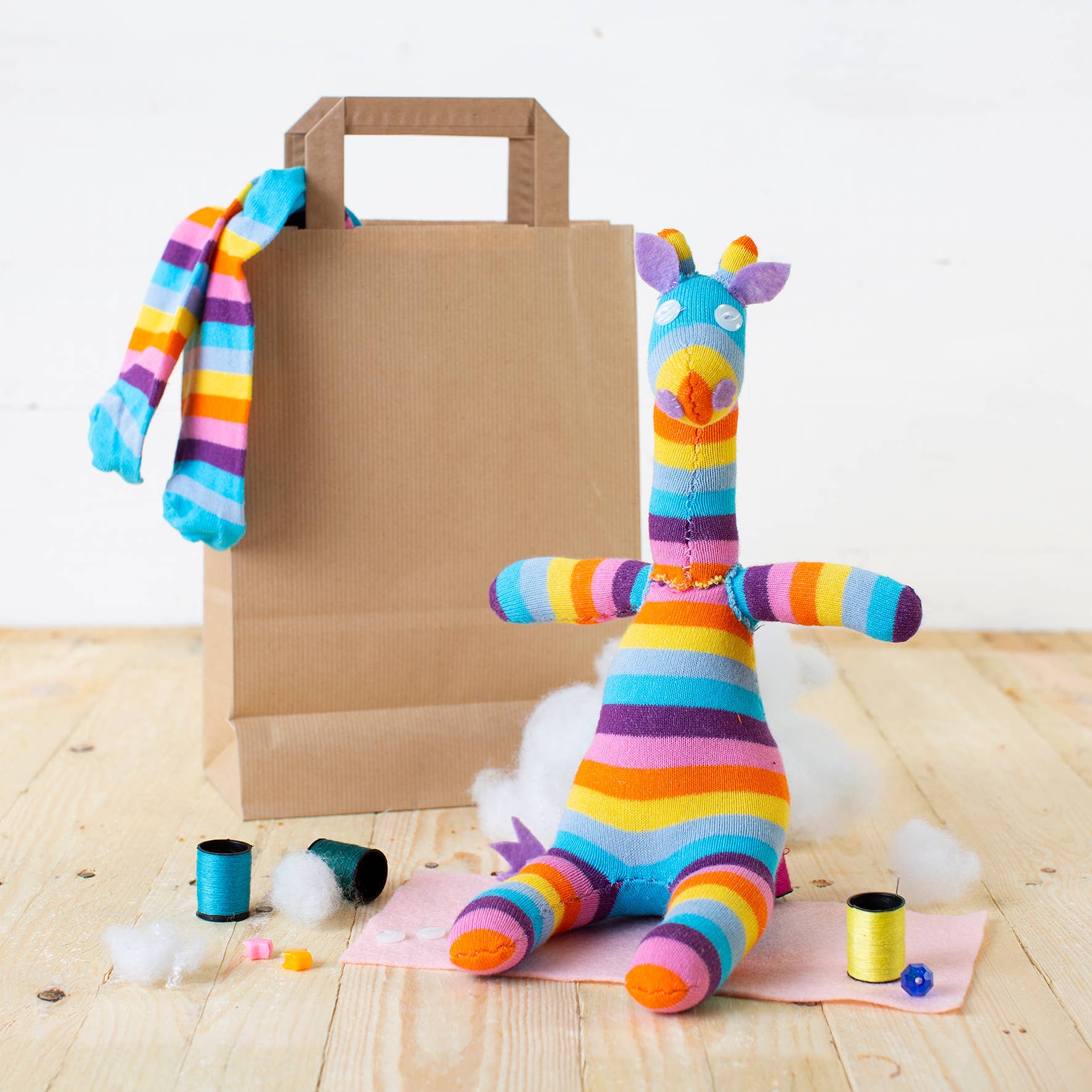 A complete craft kit containing everything you need to create your own Sock Creature! Kit includes: instructions, template, socks, stuffing, needle & thread and items to decorate your creature. Suitable for age 8+. Sock colour may vary from photographs. Fun, bright striped socks in various colour ways will be included. Kit size: Height 28cm, Width 20cm, Depth 10cm.WARNINGS – Suitable for age 8+, however children under 14 should be supervised by an adult. Contains small parts and sharp needle. Keep out of reach of children under 3 years old. Finished creature must not be given to children to pay with. Keep away from fire.