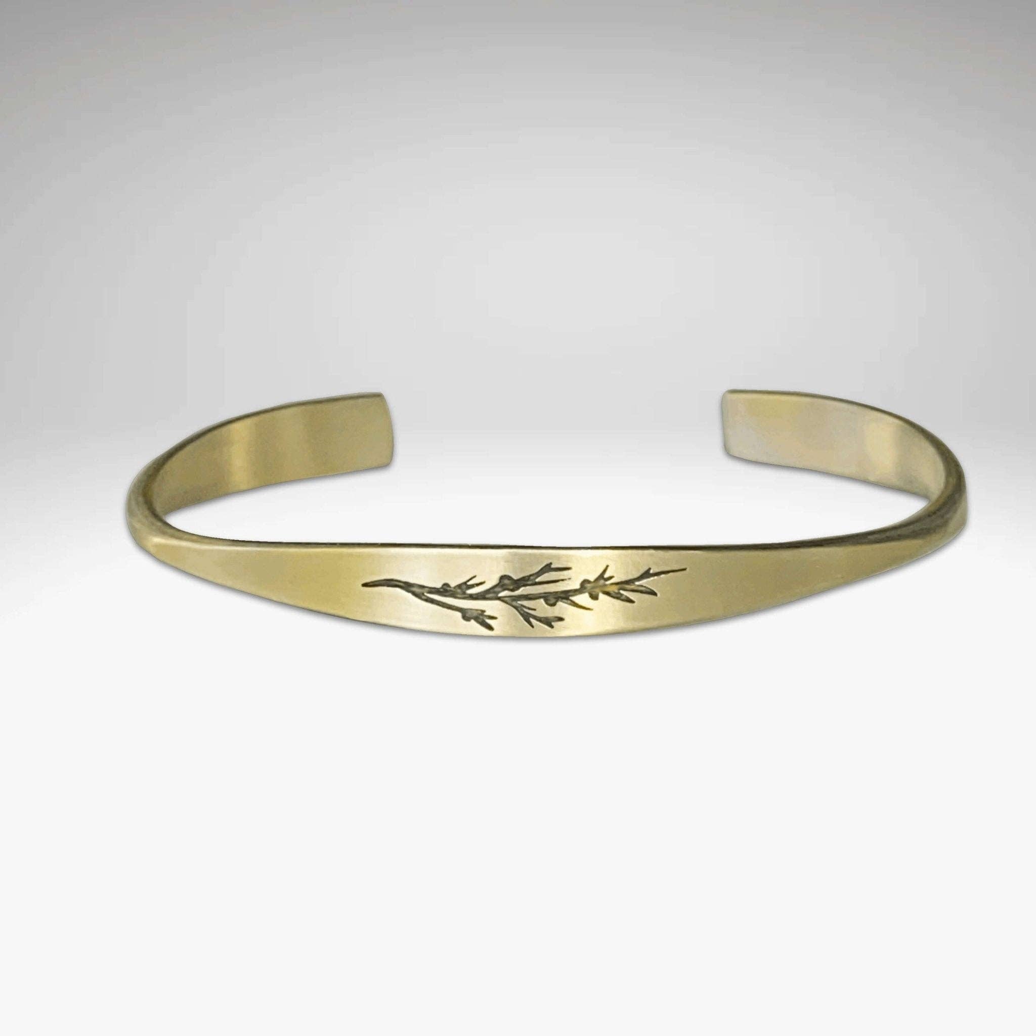 Take a piece of the beautiful pine forest wherever you go with this juniper cuff. This sweet cuff is just 1/4" at the widest point. We have etched a simple juniper twig into the solid brass using our acid-free process. This style is offered in two finishes: Matte Silver and Antique Brass. Click here to learn more about our process. Details * Width: 1/4" at the widest * Length: 5.75" * Adjustable * Handmade in Montana * Nickel, lead and cadmium free