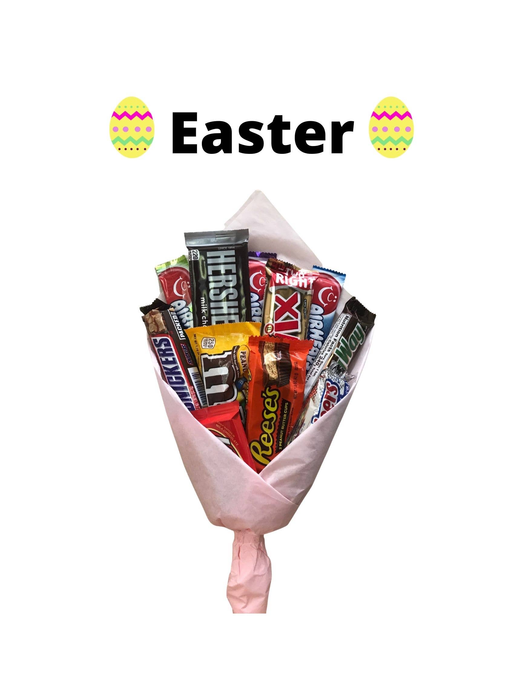 Give the gift of a candy bouquet to someone special for Easter this year. An awesome way to make someone's day even more fun and special for Easter by adding a candy bouquet! In this bouquet you will receive: (all assorted flavors) 1- Skittles 1- Sour patch kids 1- Bottle Pop Lollipop 1- Ring Pop 1- Nerd Rope 2- Pop Rocks 4- Airheads