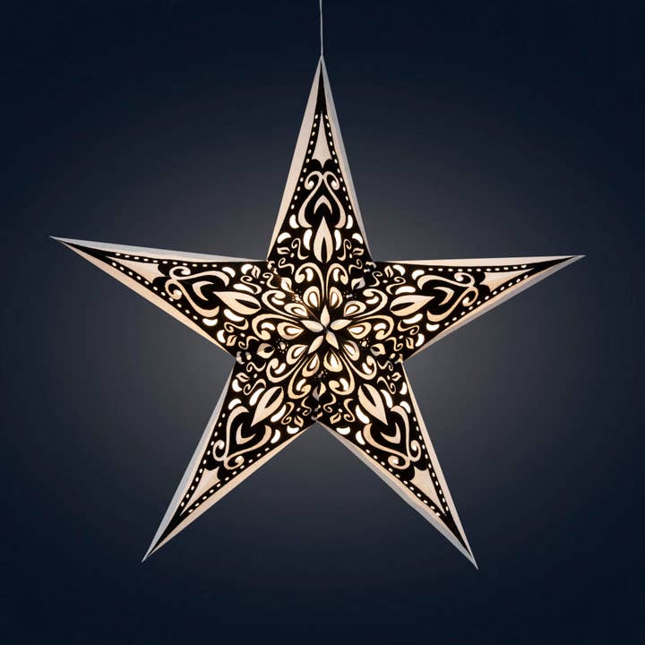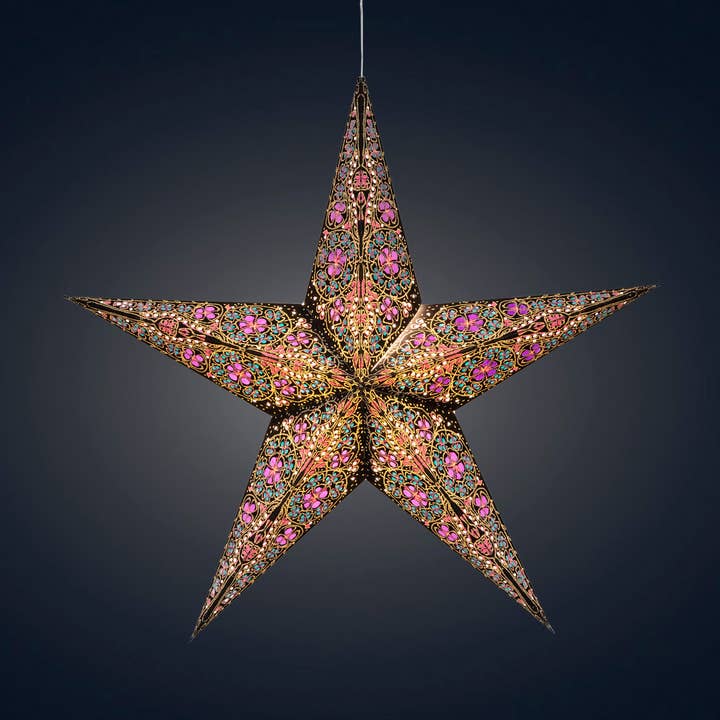 blue / green with pink/blue tissue inlay 5 Pointer, Ø 24-inch depth, 10-inch The whirling and changing symmetric pattern of the Kaleidoscope is ever tantalizing. What Makes Artschatz Star Lights Unique: Each star is handmade in India and assembled right here in New York. We carefully check every one for quality. Unlike most paper stars, Artschatz Stars hang symmetrically with the tip pointing upward—reflecting the traditional symbol of protection and luck. The pre-installed clear cable exits through the top point for proper orientation and fast setup, you will find that others hang awkwardly from a side seam. Each star features a slim cable, energy-efficient LED bulb, 5V USB AC adapter, and a unique magnetic closure system for easy, secure assembly.