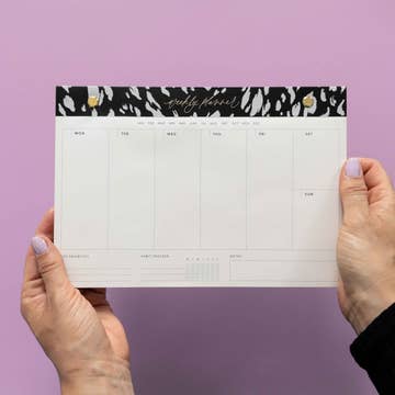 New for 2023, our desk planners are the perfect addition to your workspace. The minimal design allows you to structure your days as you prefer, but there's also room for jotting down your priorities, weekly habits and a space for your notes. Gold edges, gold foil and gold screws add a touch of elegance to our Noir design. FEATURES: • 60 pages • 120gsm Ivory FSC-certified paper • 170 (H) x 250 (W) mm • Gold gilt edging on 3 sides • Perforated at the top OUR COMMITMENT: Printed on FSC-certified paper: We are committed to responsible forestry and we believe that healthy forests are of crucial importance in the fight against climate change. Manufacturing: We only work with socially compliant manufacturers in China and Europe. ** Please do not use marker pens or Sharpies as these will bleed through the pages.**