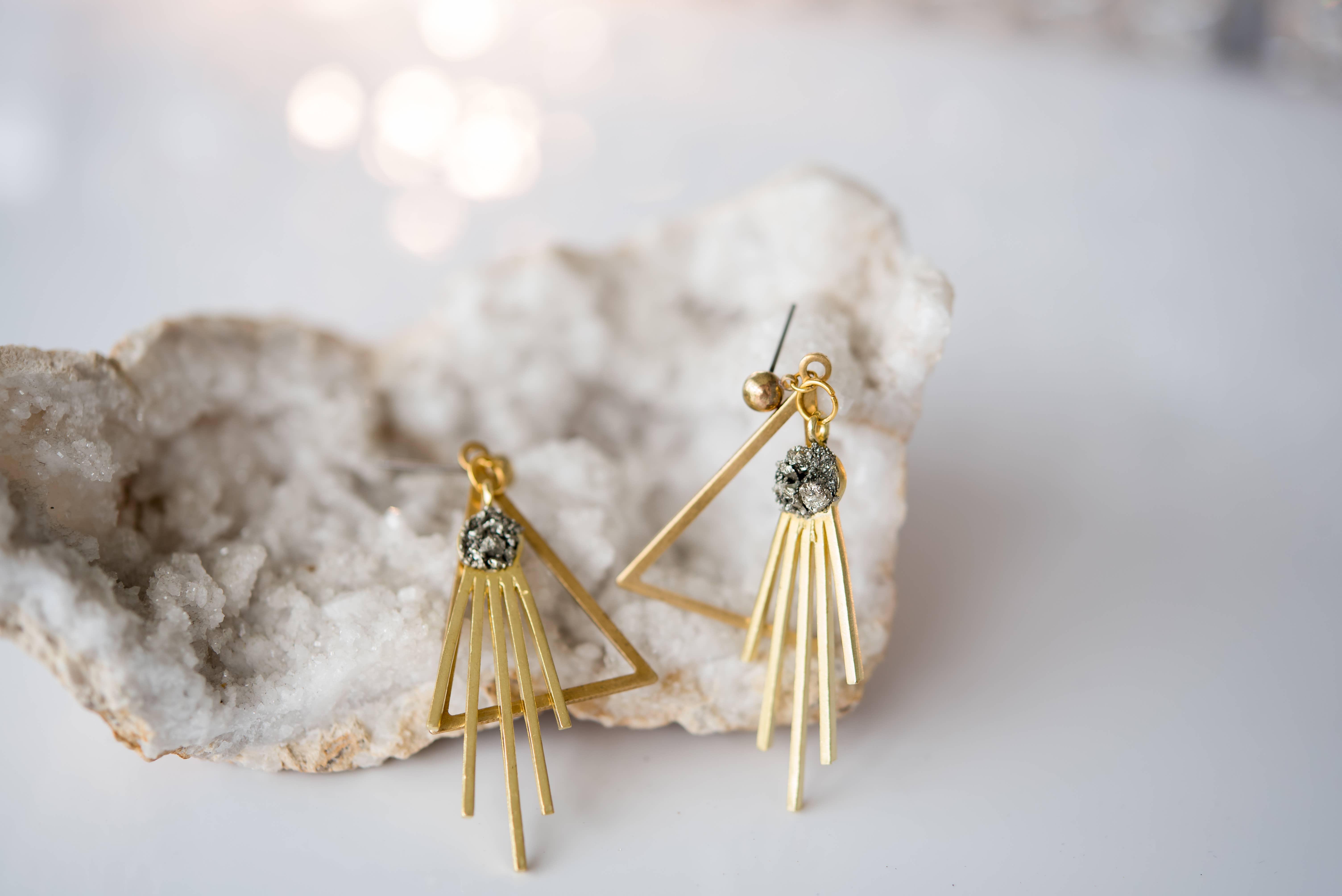 **** As Seen on The Young and The Restless actress Jess Walton as Jill Abbott S47 Ep20 **** **** As seen on The Young and The Restless actress Courtney Hope as Sally Spectra S49 Ep11*** Long, sleek and sparkly, these silver plated dagger earrings are the perfect statement earring for all occasions. Each pair of earrings has been carefully adorned with raw pyrite that give them a magnificent luster somewhere between gold and silver. Pyrite is said to inspire creativity, protects against harm or danger as well as enhances assertive energies. The earrings hang about 3.25 inches in length, rising just about the shoulders and are topped off with a rose gold nickel and lead free french ear wires. Please note: it is normal for small flecks of pyrite to come loose over time with normal wear and tear.
